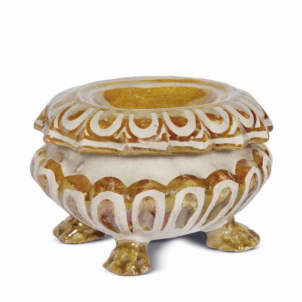 in maiolica con smalto bianco lumeggiato a lustro dorato, corpo ovoidale prodotto a stampo con applicazioni e lavorazioni a stecca, vaschetta dal bordo estroflesso e base con piedini zoomorfi. Il corpo è sottolineato da pannelli con lumeggiature dorate a sottolineare la forma delle baccellature e delle zampe. Un confronto particolarmente prossimo ci viene fornito da una saliera a corpo ovale coerente per decoro conservata nelle raccolte di Arti Applicate del Castello Sforzesco di Milano, per la quale gli autori della scheda ricordano la definizione del Piccolpasso, che cita “gli abborchiati” facendo riferimento a saliere simili. Le saliere abborchiate sono prodotte dalle botteghe derutesi a partire dal la seconda metà del XVI secolo e la forma perdura nella produzione di tutto il secolo successivo, datazione indicata dal butto del Monastero di San Anna a Foligno; cm 9x14x12