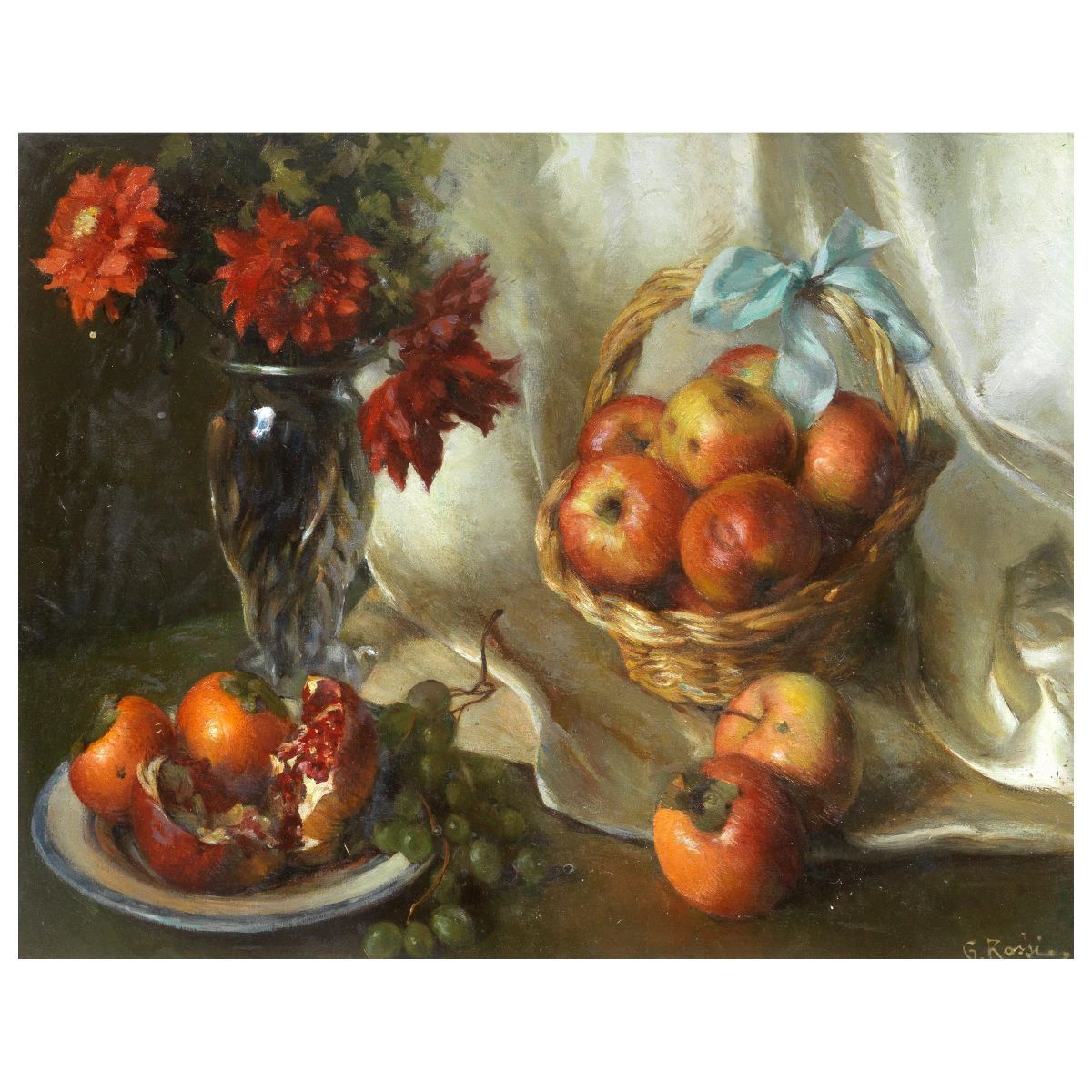Giuseppe Rossi (Firenze 1876 - Padova 1952) COPPIA DI NATURE MORTE CON FIORI E FRUTTA olio su tavola, cm 52x64 firmate rispettivamente in basso a destra e in basso a sinistra