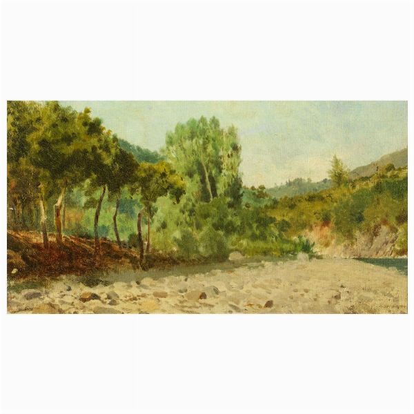 Tito Conti (Firenze 1842 - 1924) PAESAGGIO CON RUSCELLO olio su tela, cm 28,5x49 firmato in basso a sinistra retro: sul telaio firmato e datato '12.12.17'