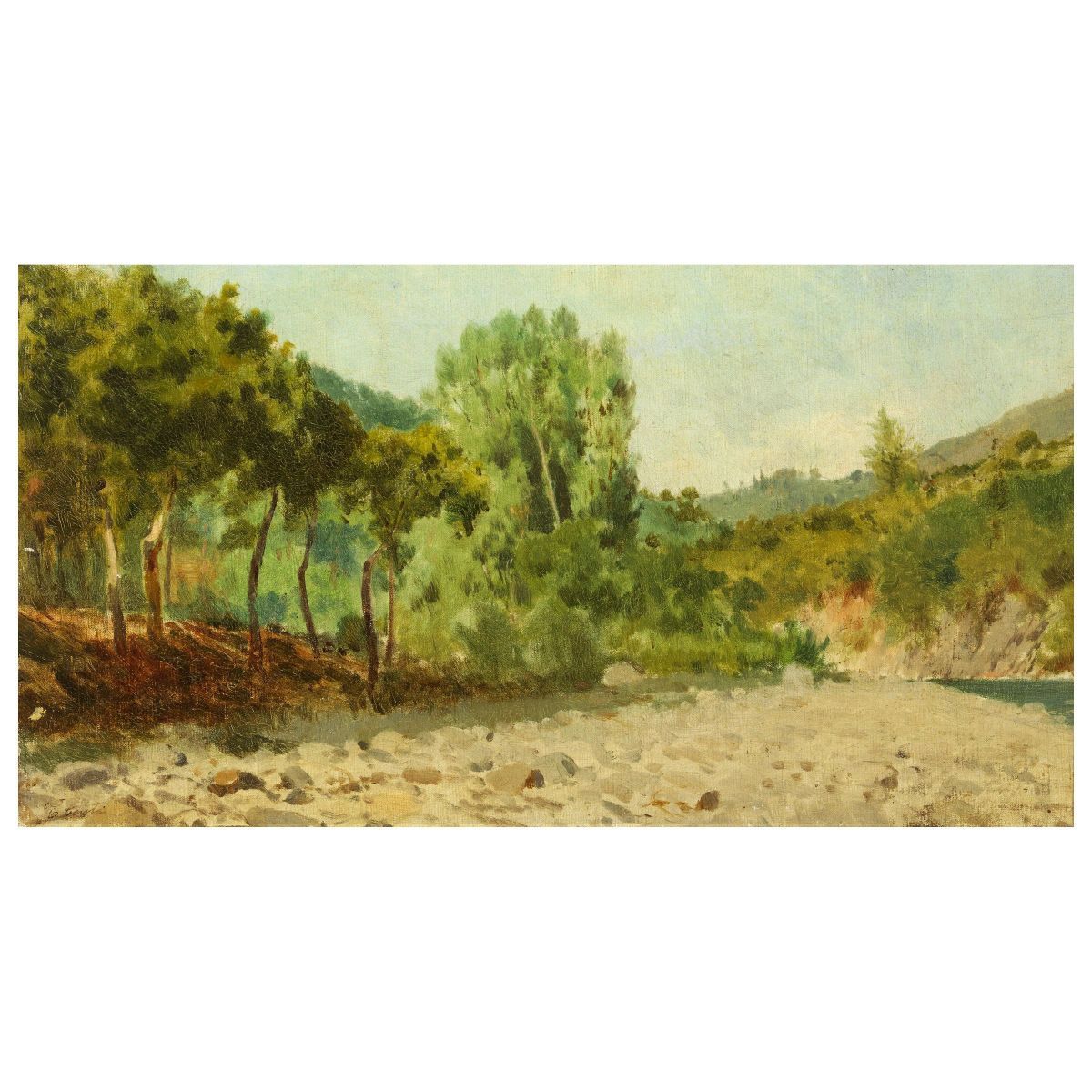 LANDSCAPE WITH STREAM oil on canvas, 28.5x49 cm signed lower left on the reverse: on the stretcher signed and dated '12.12.17'