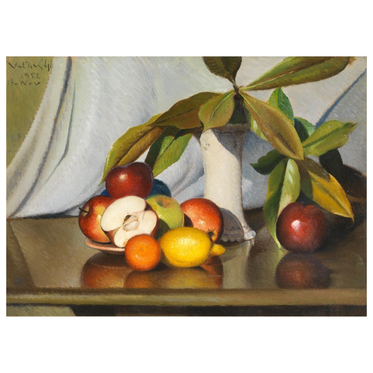 Valentino Ghiglia (Firenze 1903 - 1960) NATURA MORTA olio su cartone, cm 50x68 firmato e datato “1952 13 Nov” in alto a sinistra retro: cartiglio della Galleria d’arte La Navicella di Viareggio