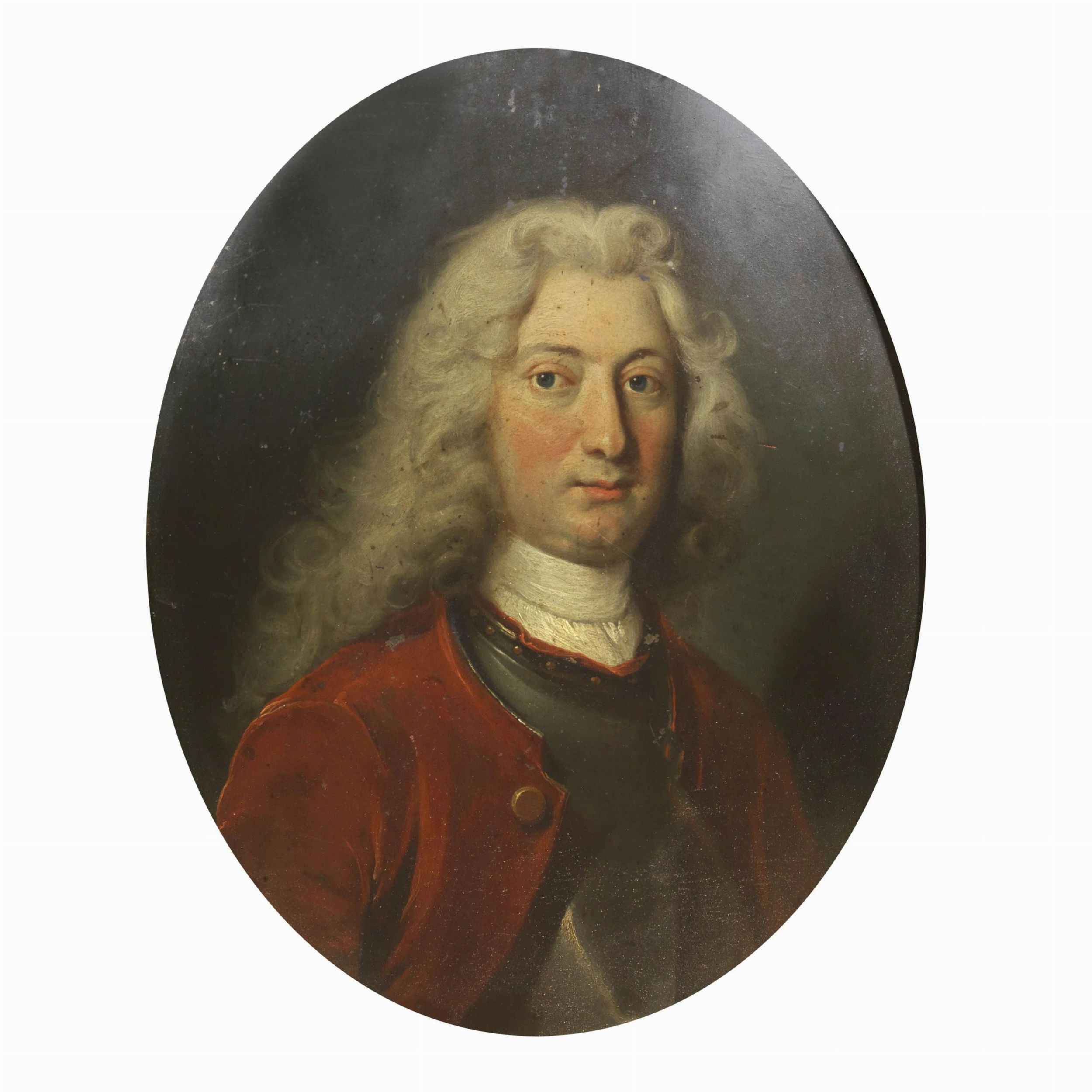 English school, 18th century PORTRAIT OF A GENTLEMAN WITH A RED COAT oil on copper, cm 41x32 On the back, on the support, the work has the following inscription S.I. - Ae(tatis) 31 1714