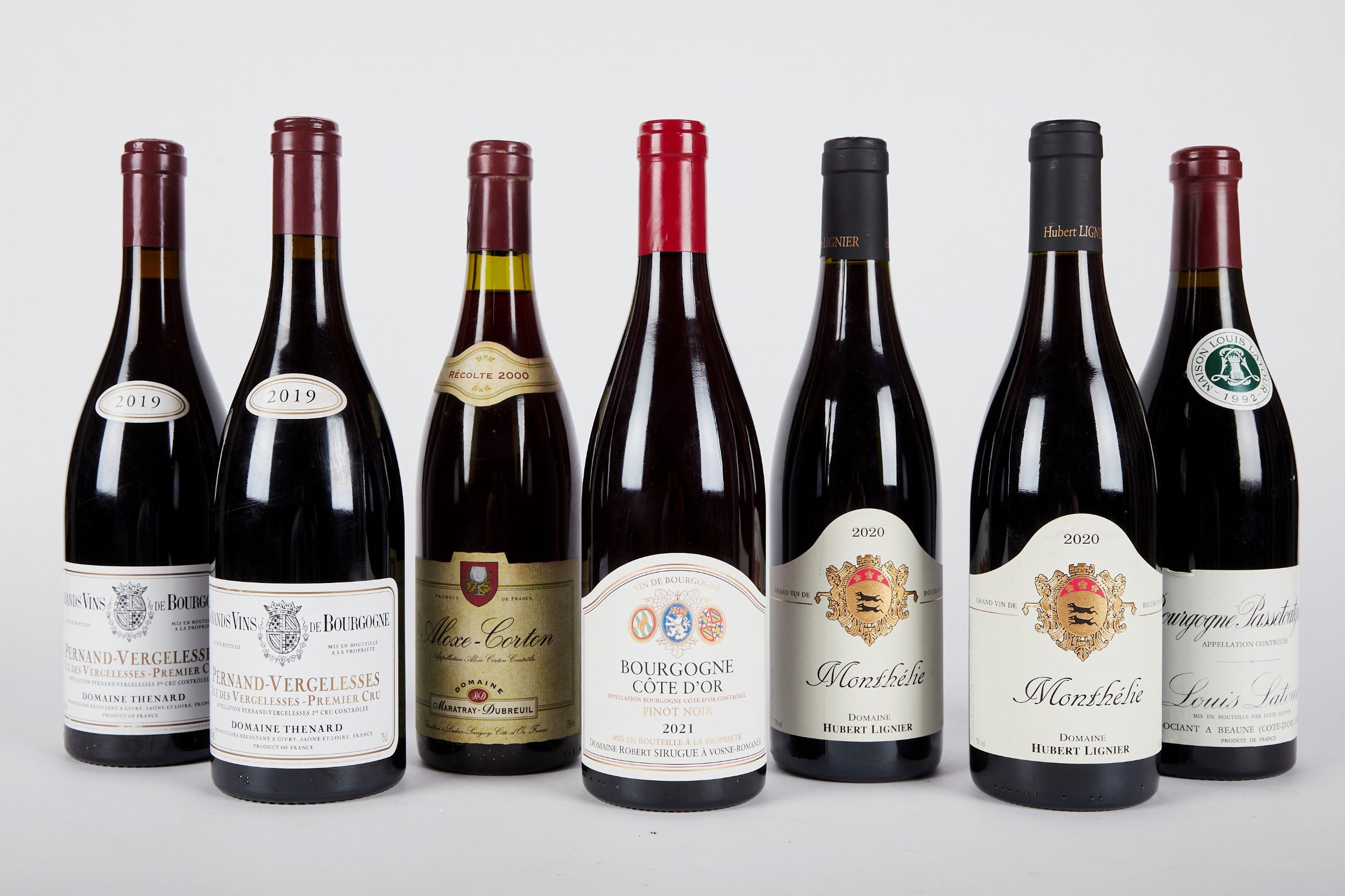 2 Domaine Hubert Lignier Monthelie, Cote de Beaune 2020 2 Domaine Baron Thenard Ile des Vergelesses, Pernand-Vergelesses Premier Cru 2019 1 Domaine Robert Sirugue Bourgogne Cote d'Or 2021 1 Bourgogne Passetoutgrain Louis Latour 2021 1 Aloxe Corton Domaine Maratray Dubreuil 2000