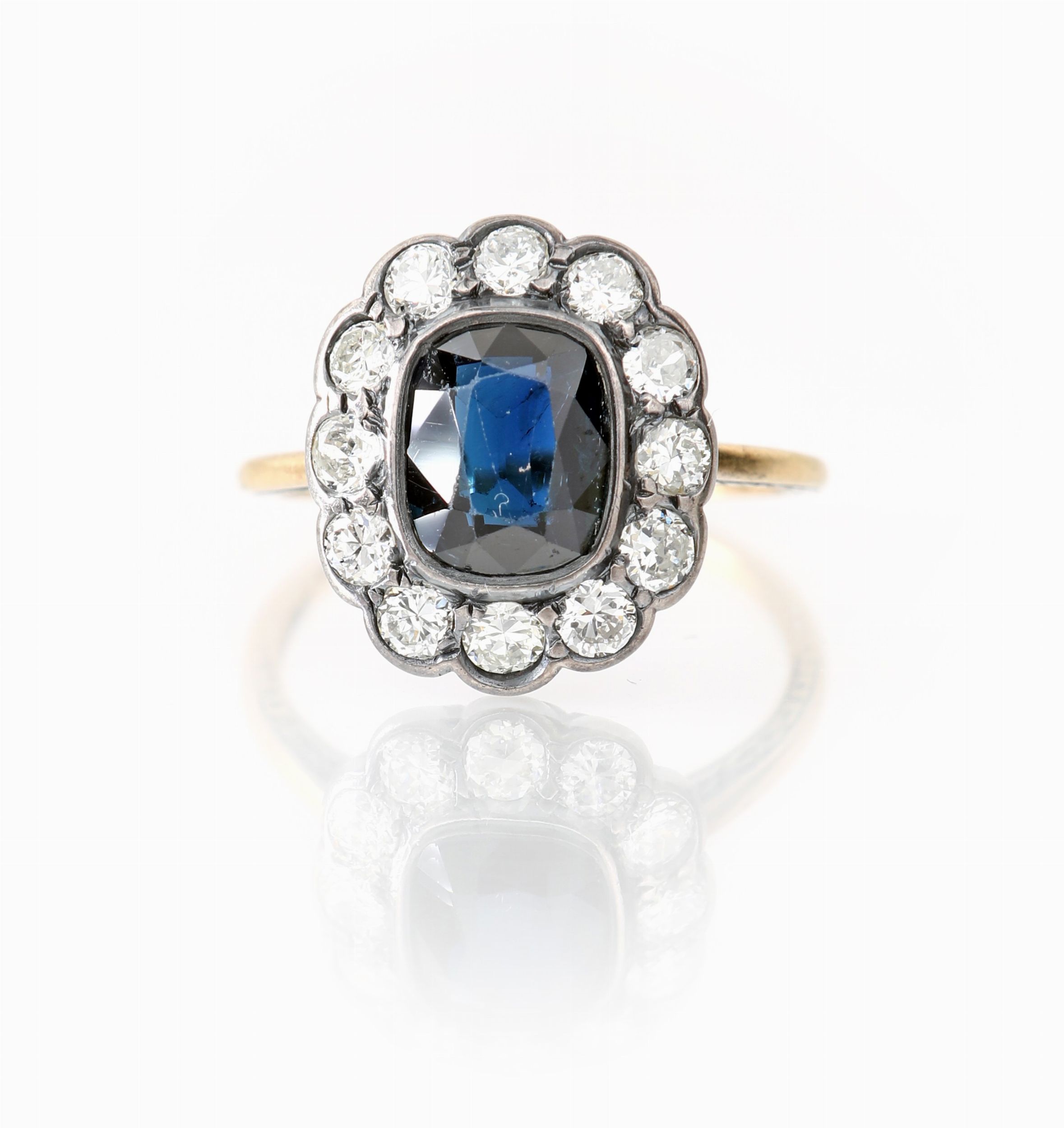 Oro giallo 750/000. Diamanti in taglio antico ct. 0,60 ca e zaffiro in taglio cuscino ct. 1 ca. Peso complessivo gr. 2,40
