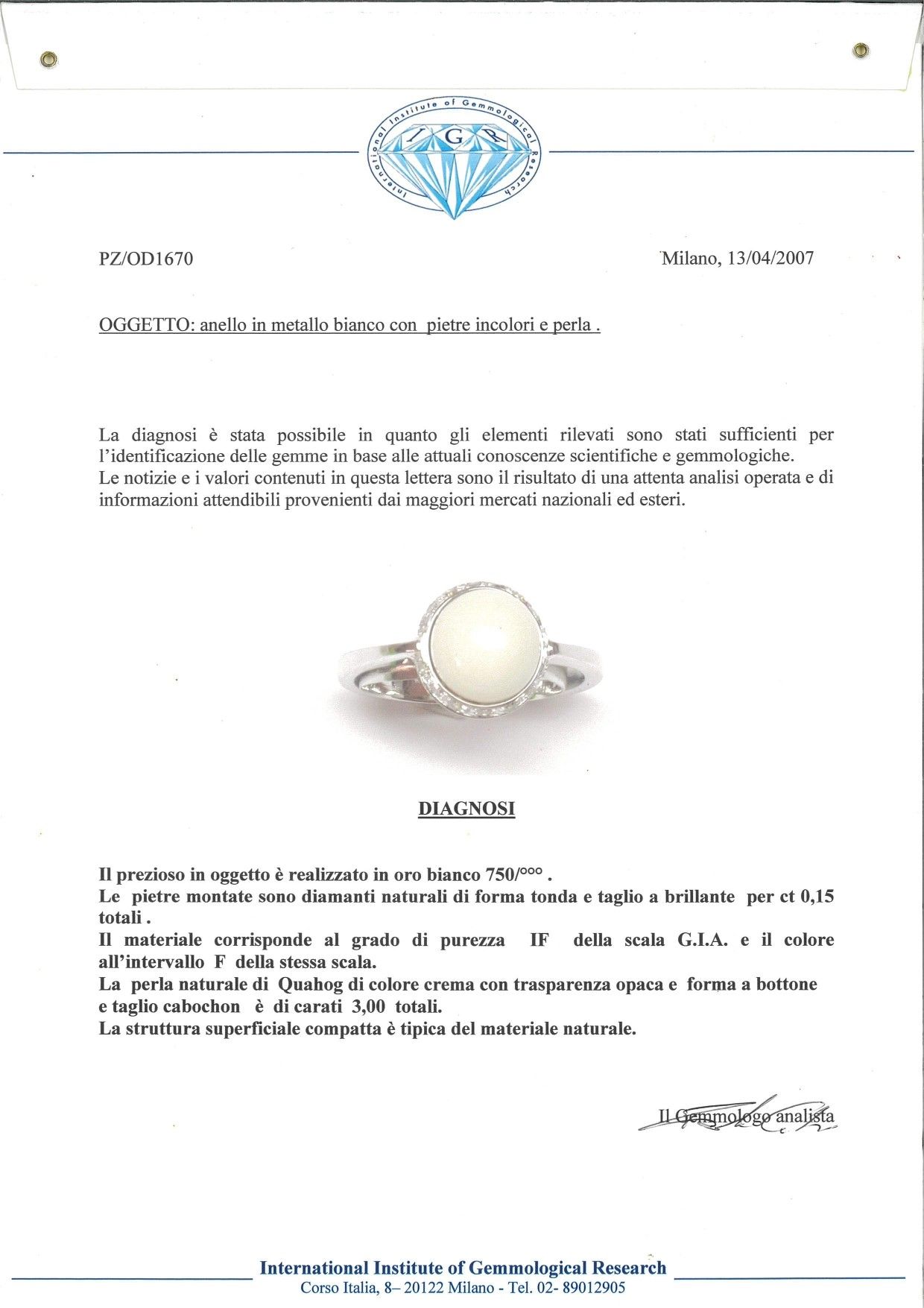 Oro bianco 750/000. Perla Quahog naturale spontanea ct. 3 mm 9x8. Diamanti in taglio rotondo brillante ct. 0,15, F, IF. Peso complessivo gr 5. Corredato di certificazione gemmologica IGR n° 1670