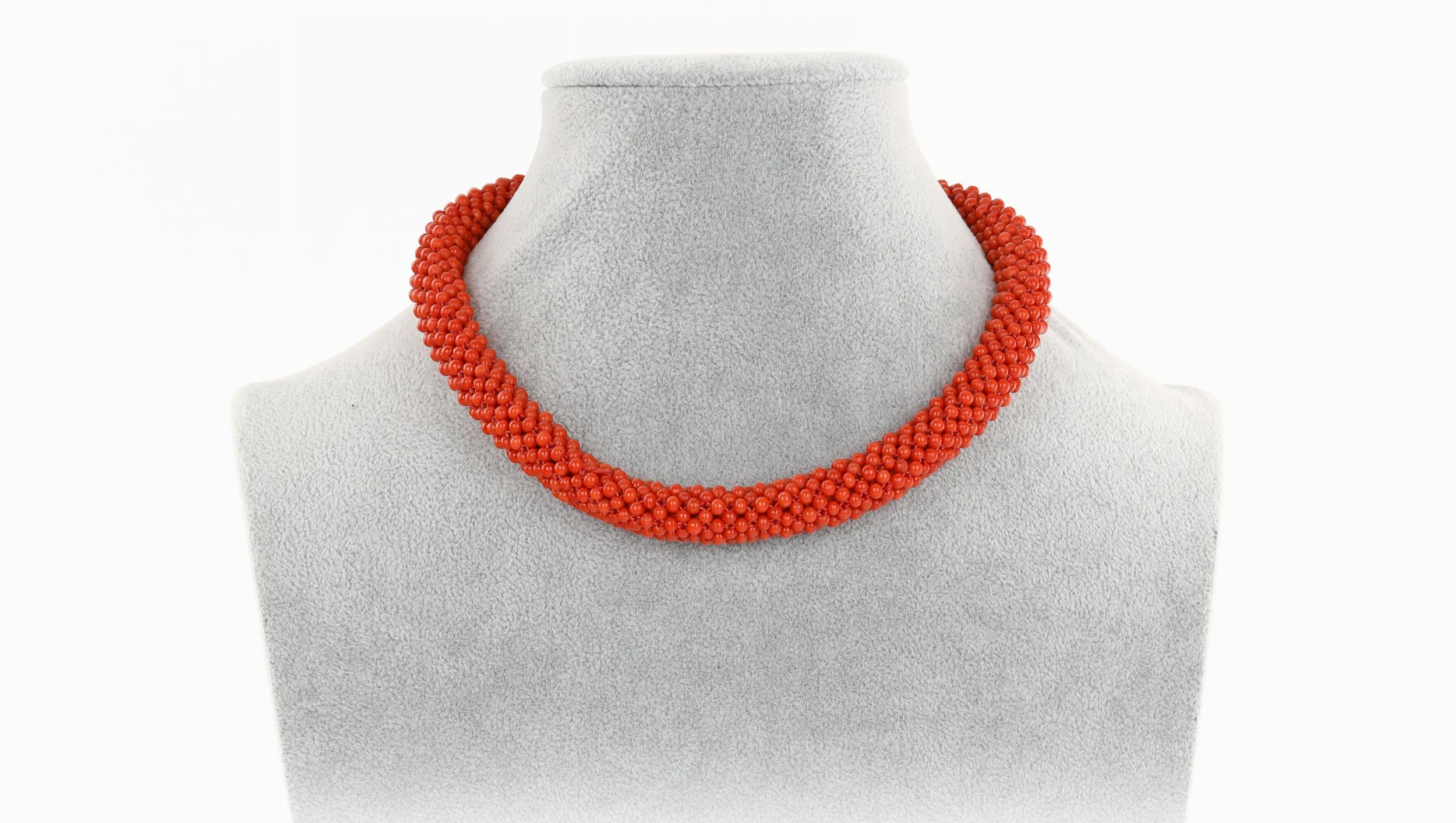 Collana in corallo rosso con infilatura tubolare e chiusura in argento
