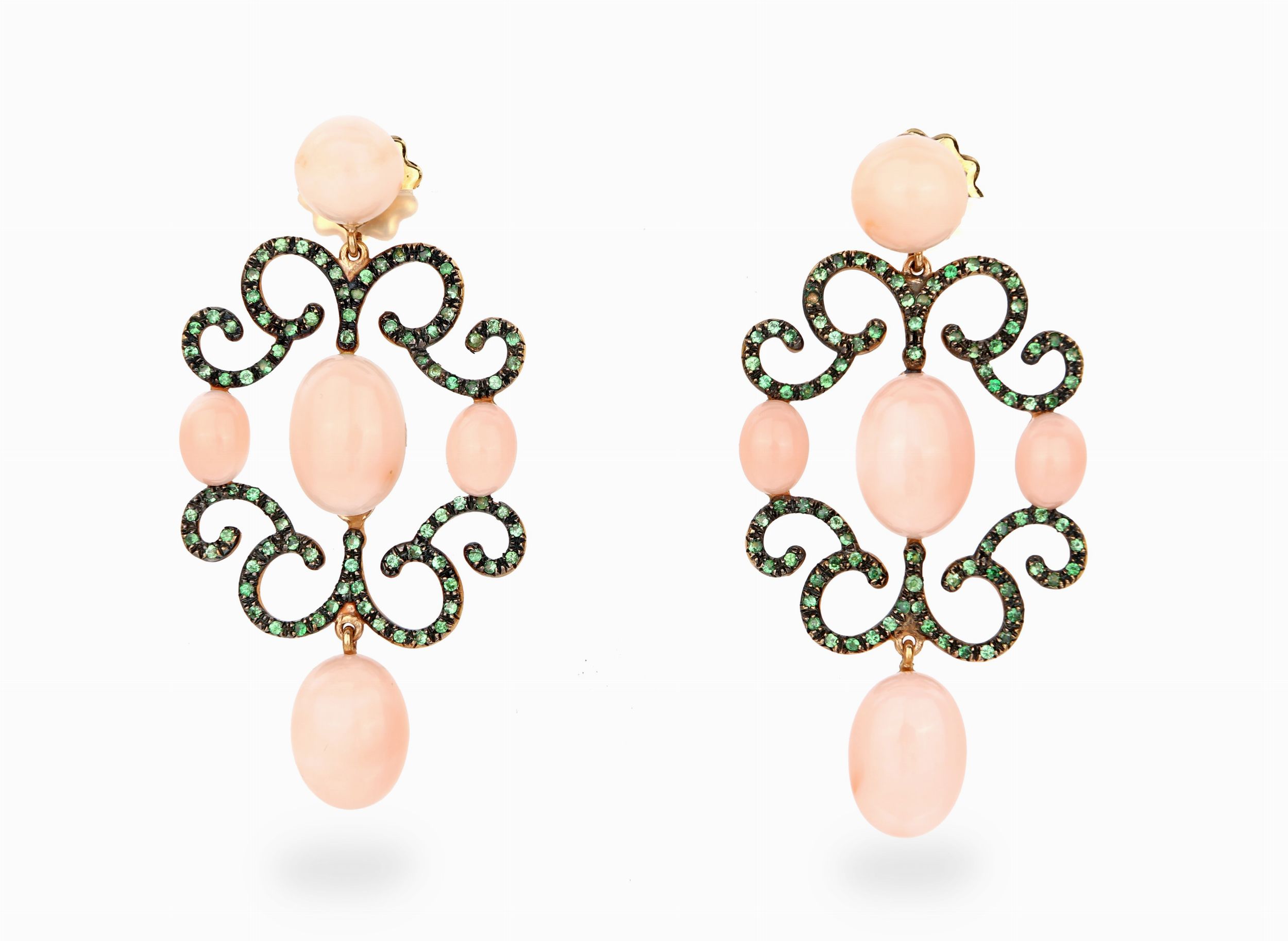 Coppia di orecchini pendenti in oro, tsavoriti e corallo