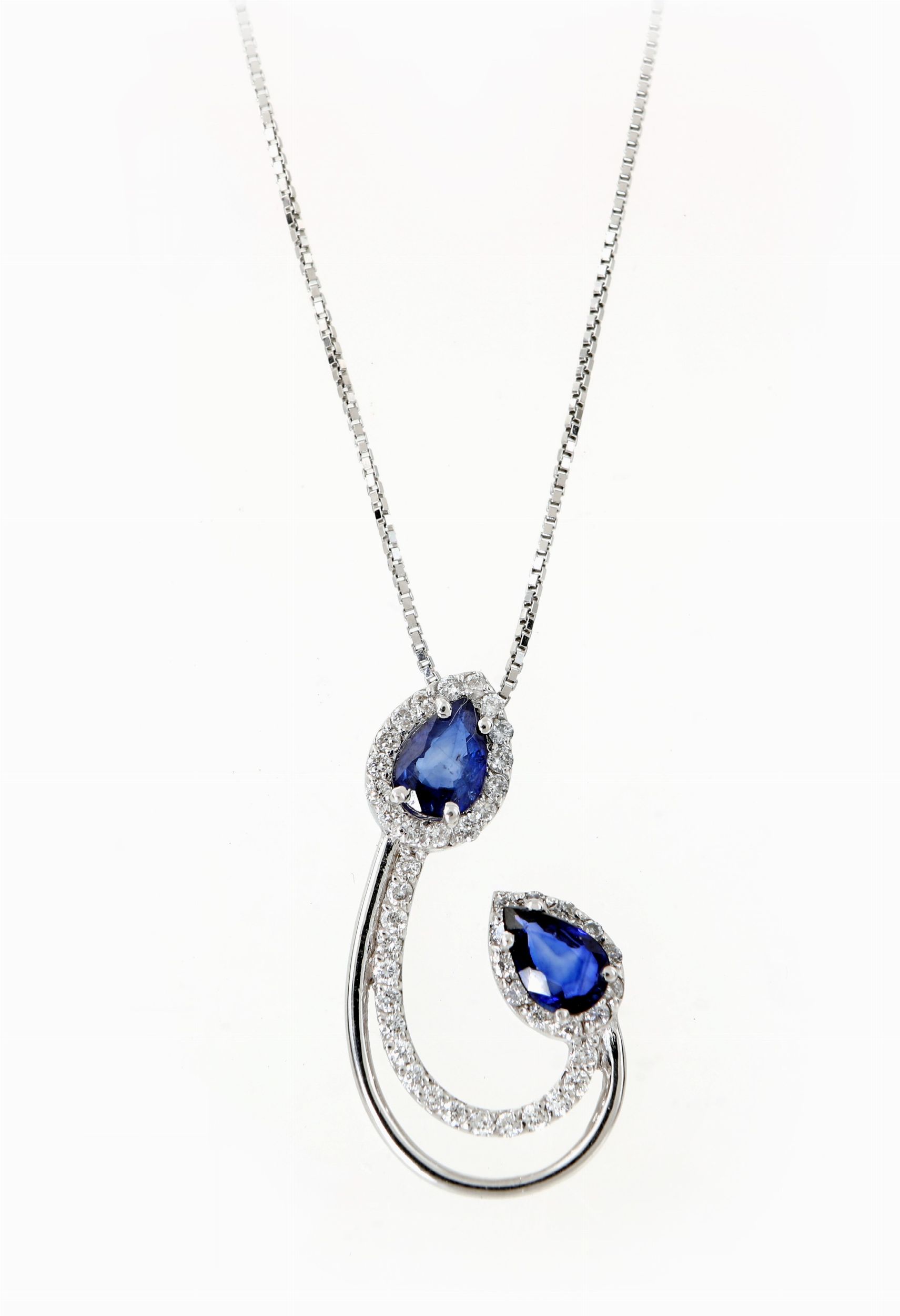 Oro bianco 750/000. Diamanti in taglio rotondo brillante ct. 0,40 ca. , zaffiri in taglio goccia ct. 1 ca.Peso complessivo gr. 3,70