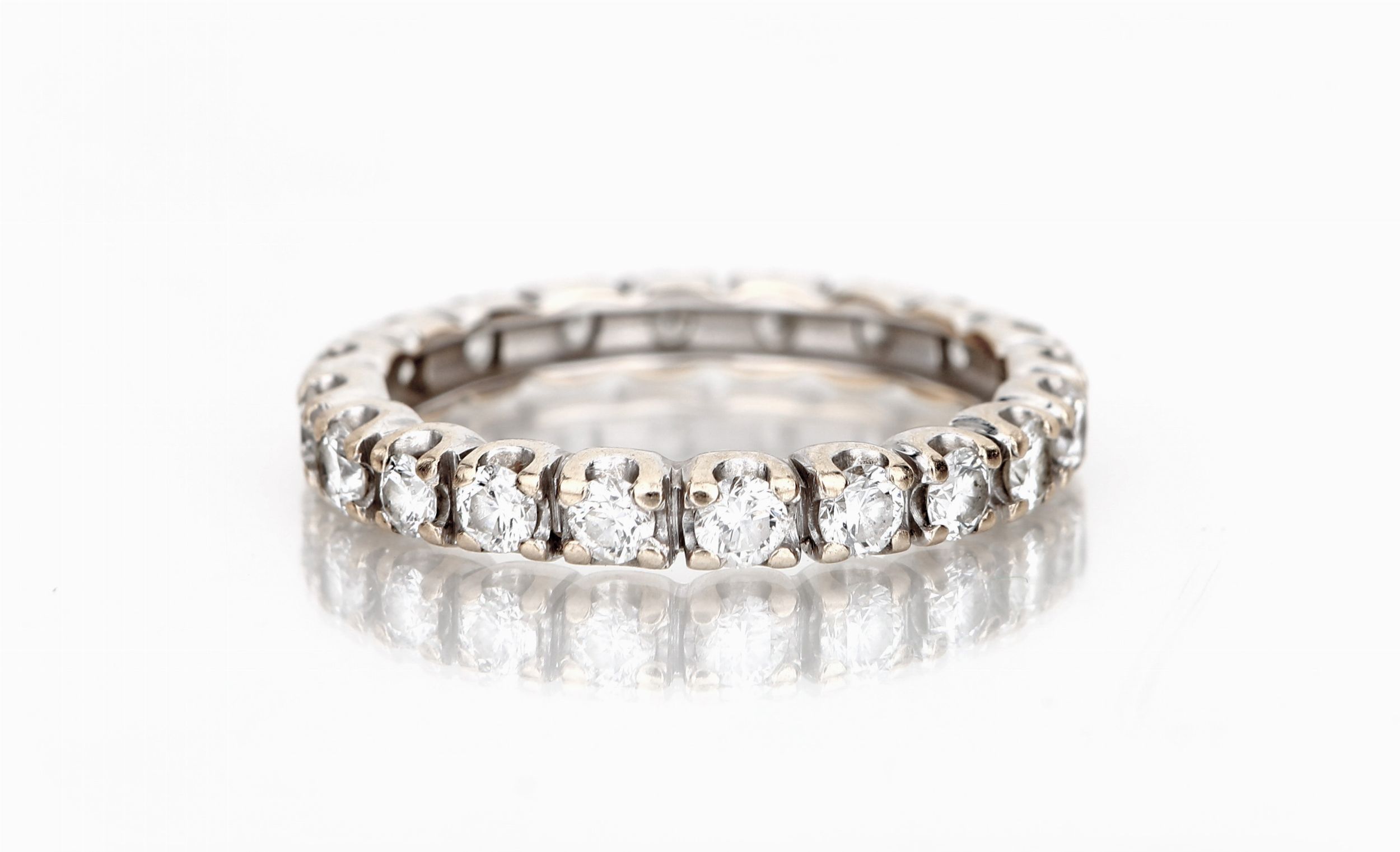 Oro bianco 750/000. Diamanti in taglio rotondo brillante ct. 1,50, prob G, VS-VVS. Peso complessivo gr. 4.