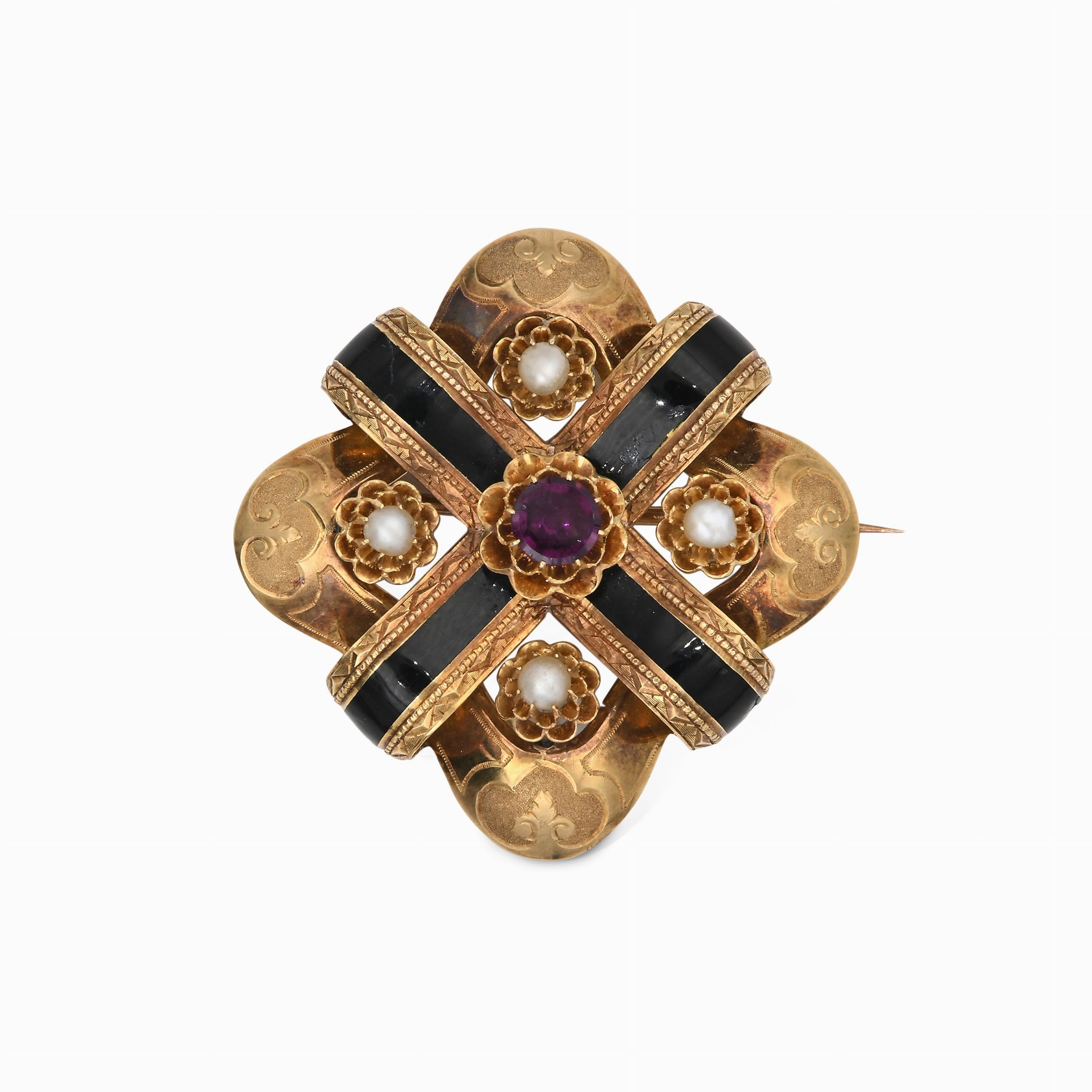 Spilla antica borbonica in oro, perle, smalto e pietra rossa