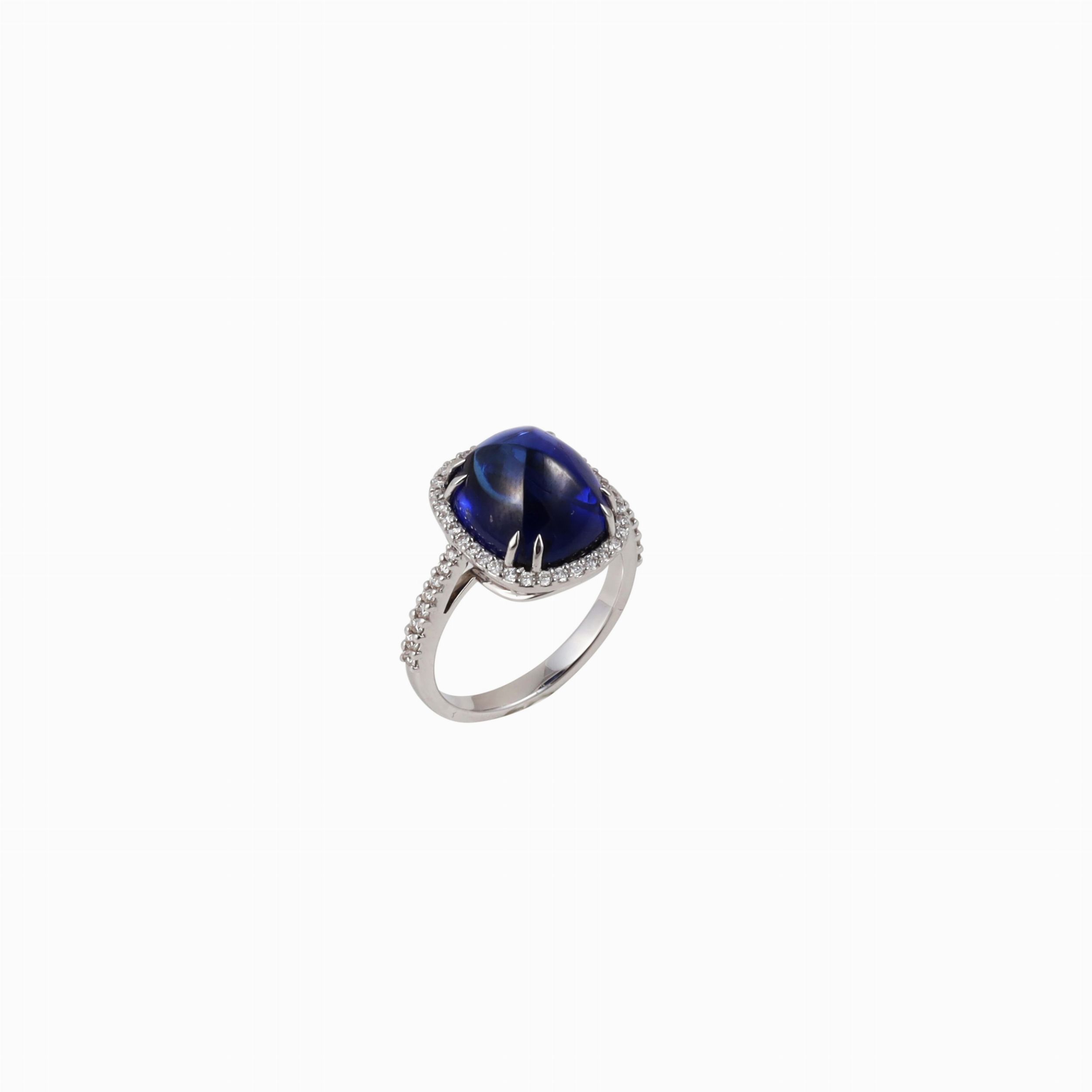in oro bianco con zaffiro taglio cabochon 'sugar loaf' del peso di 11,95 ct, contornato da brillanti riproposti anche su parte del gambo, gr. 6,7. Misura 15 Analisi gemmologica n. GRS2009-060265T del 02/07/2009 rilasciata dal laboratorio GRS di Lucerna