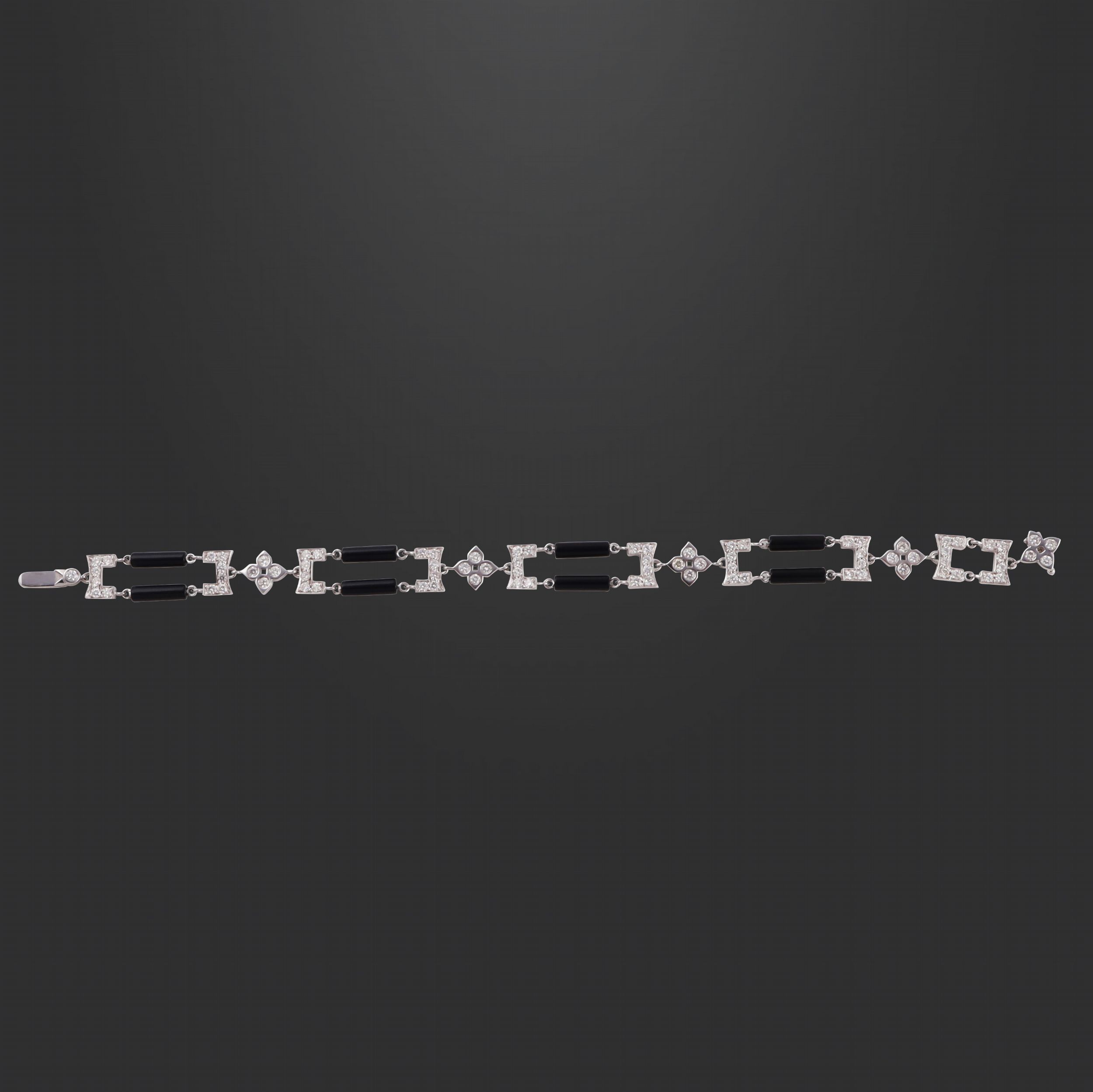 in oro bianco formato da elementi geometrici con brillanti del peso complessivo di 1,80 ct ca. e onici, gr. 11,9. Lunghezza 18 cm Numerario: 3770 AL (Luca Carati - Valenza)