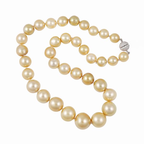 a un filo di perle coltivate 'South Sea Gold' poste in gradazione 16 / 10 mm, chiusura sferica in pavé di brillanti del peso complessivo di 1,30 ct ca. Lunghezza 46,5 cm