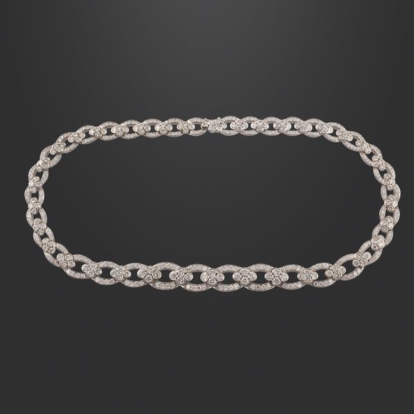 girocollo in oro con brillanti del peso complessivo di 16 ct ca., costituita da elementi ovali aperti alternati a fiori quadripetali stilizzati posti in gradazione, gr. 79,6. Lunghezza 42 cm ca.