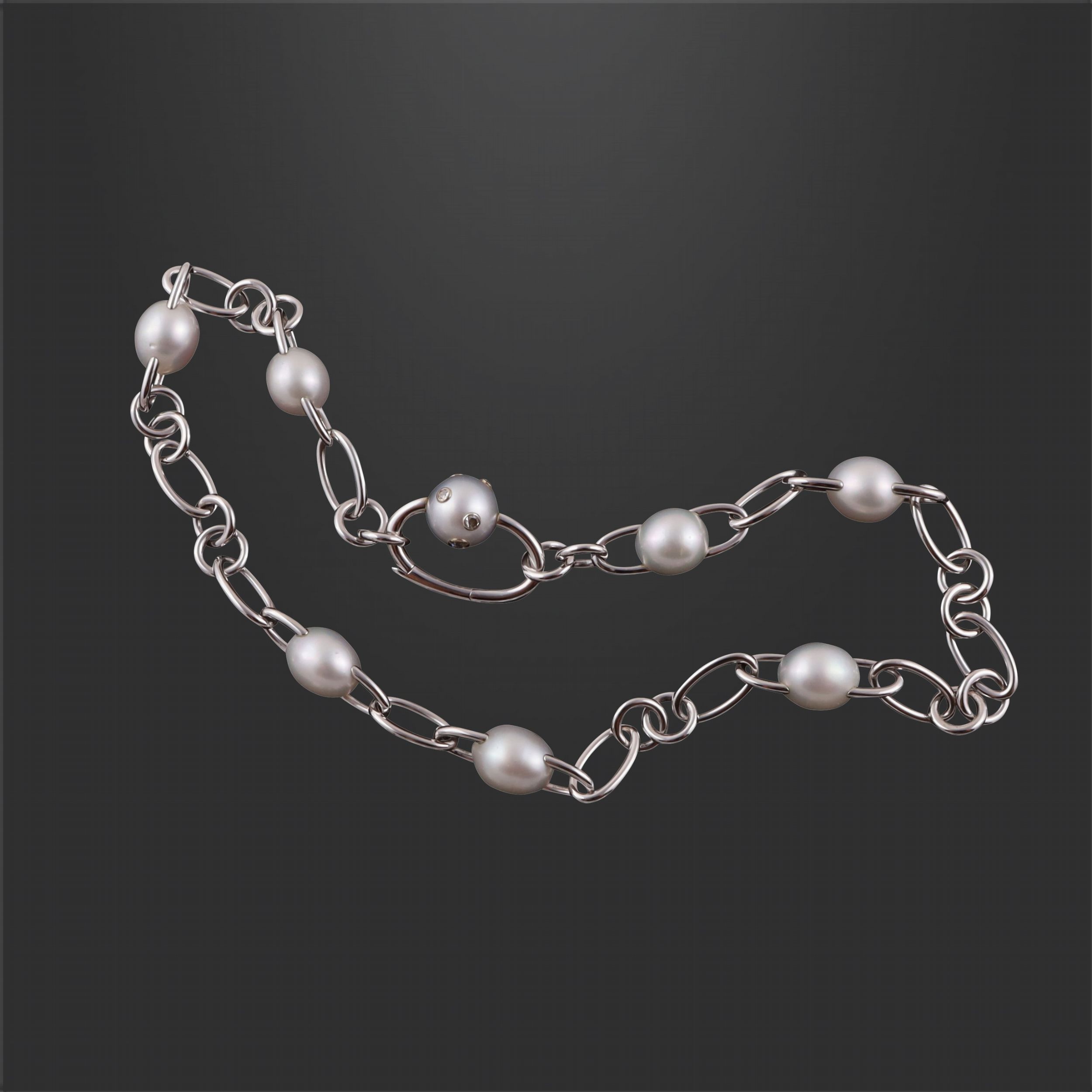 in oro bianco a maglie tonde e ovali con perle coltivate, di cui una punteggiata da diamanti taglio a rosa ad ornamento della chiusura, gr. 72,5. Lunghezza 45 cm