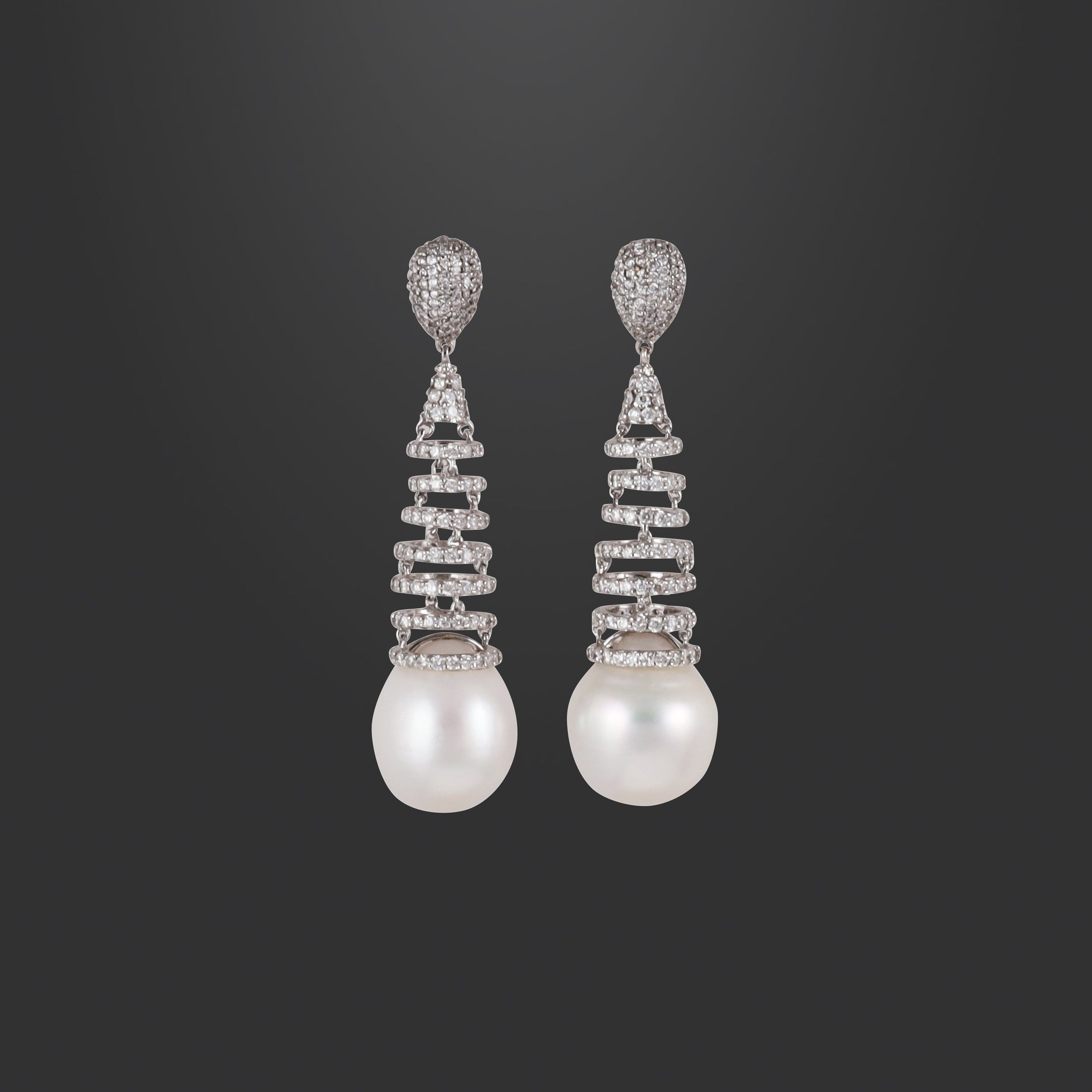 pendenti in oro bianco e brillanti, ciascuno con una grande perla coltivata 'South Sea' sospesa a una struttura conica di anelli concatenati, sorretta da un motivo a goccia, gr. 35,7. Dimensioni perle 21 x 17,8 mm ca. e 21 x 16,9 mm ca., diamanti del peso complessivo di 7 ct ca. Lunghezza 6,5 cm ca.