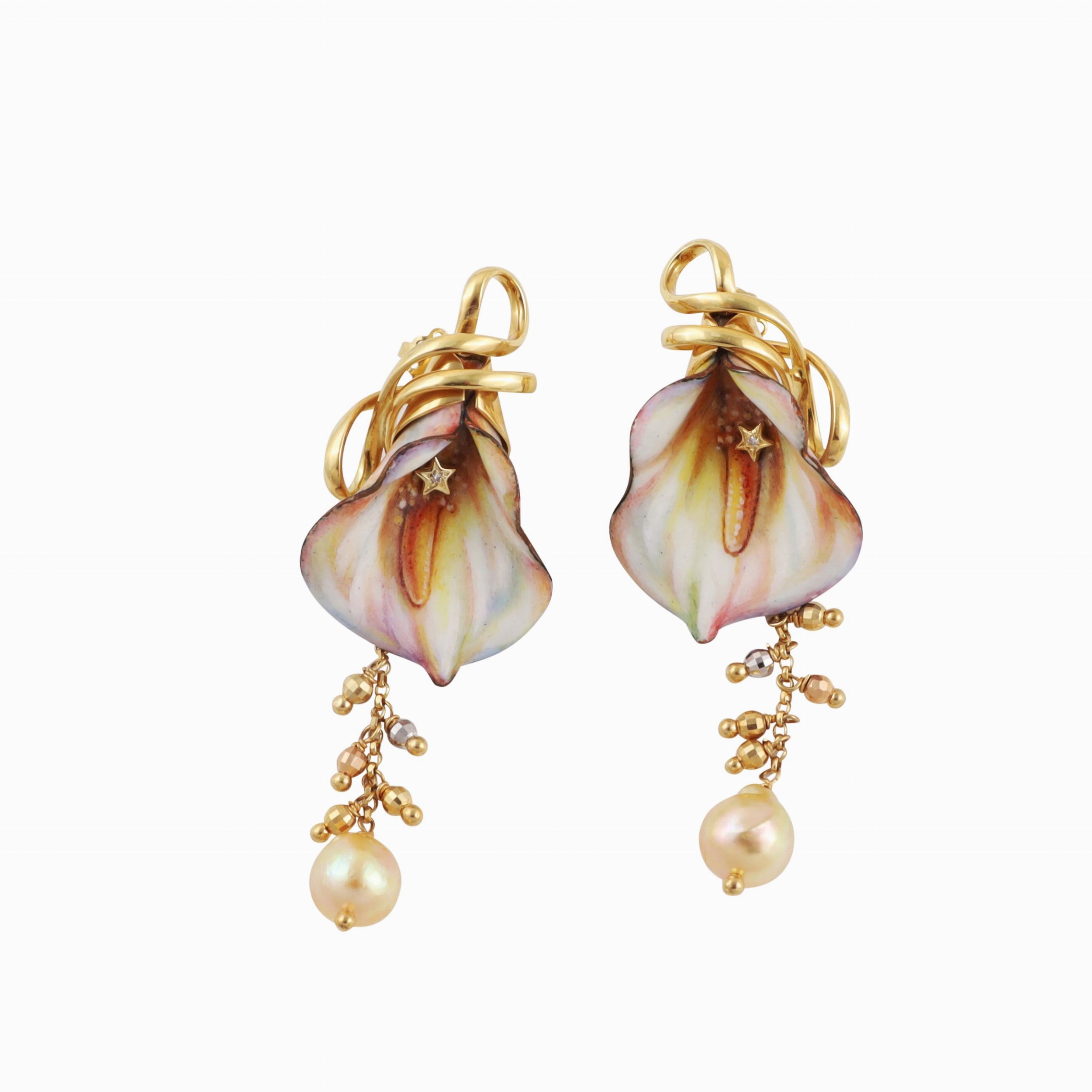 pendenti in oro giallo ciascuno con calla dipinta in smalti policromi ornata da un piccolo brillante, a sostegno di una catenella con sfere sfaccettate in oro e perla coltivata barocca terminale, gr. 25,5. Lunghezza 7 cm ca. Firmati: Rivalta