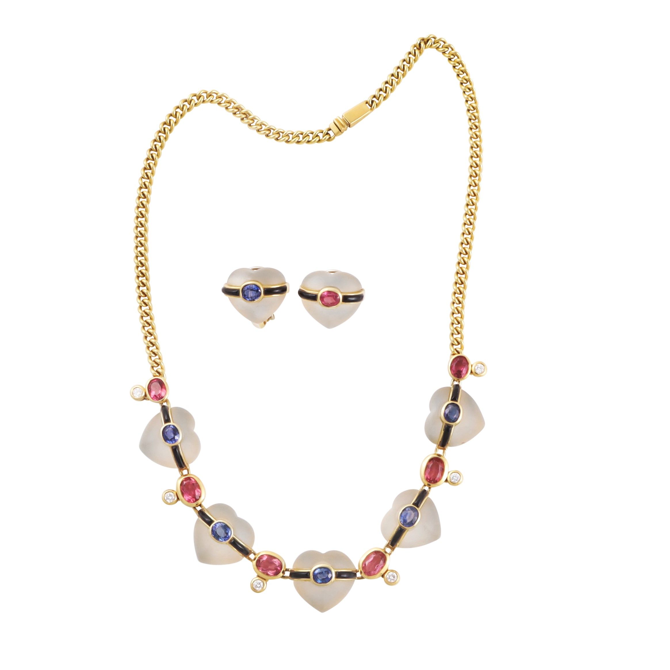 realizzata in oro giallo composta da girocollo a maglia 'groumette', evidenziato anteriormente da cinque cuori in quarzo ialino attraversati da fasce in onice con zaffiri, alternati a tormaline rosa e brillanti, orecchini a clip 'en suite', gr. complessivi 70,3. Lunghezza 41,5 cm Numerario: 26AL (Illario Carlo & F.lli - Valenza)