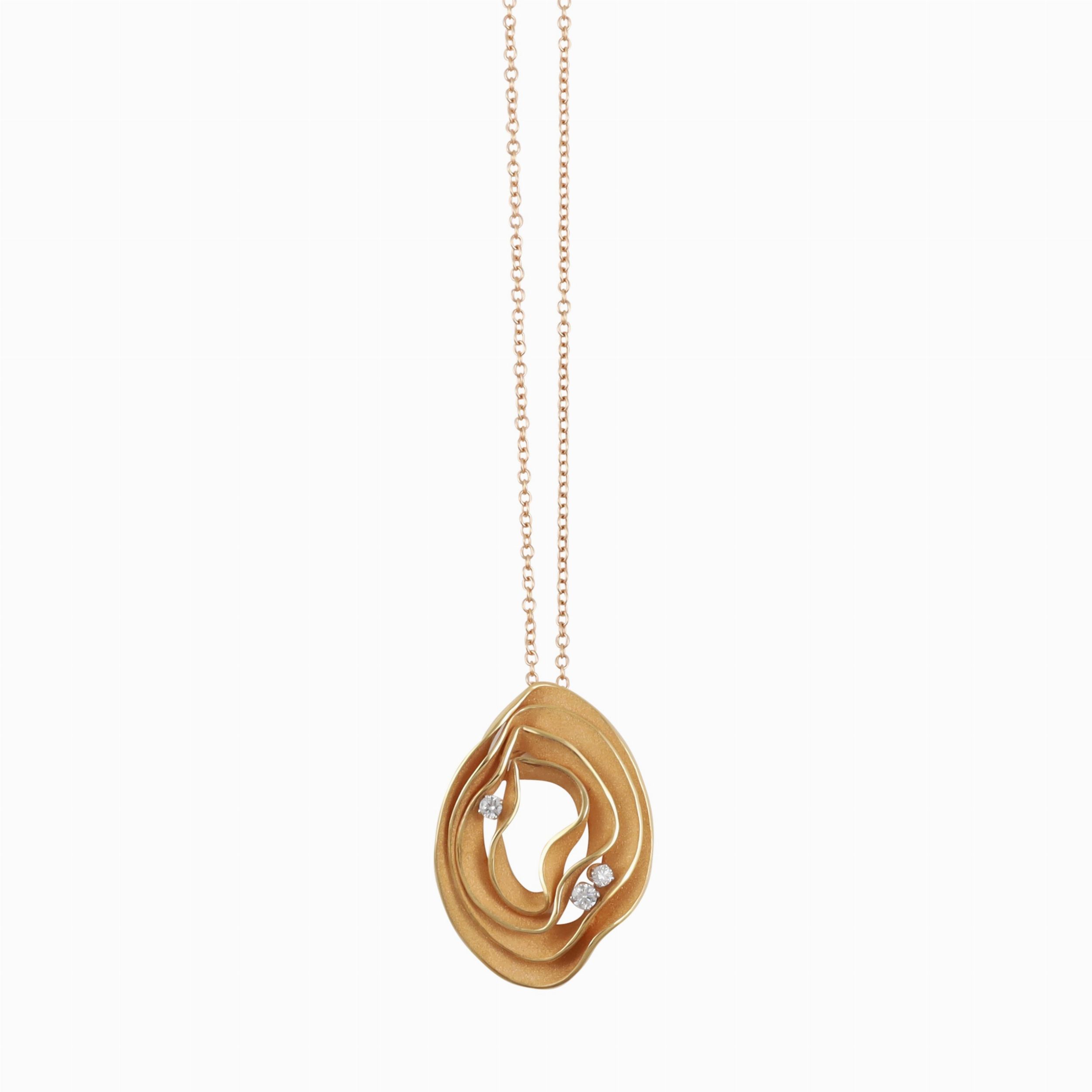 in oro rosa satinato, formato da motivi nastriformi concentrici impreziosito da brillanti, sostenuto da una catena girocollo a maglia 'rollina', gr. complessivi 11,7. Lunghezza 44,5 cm Firmati: Cammilli