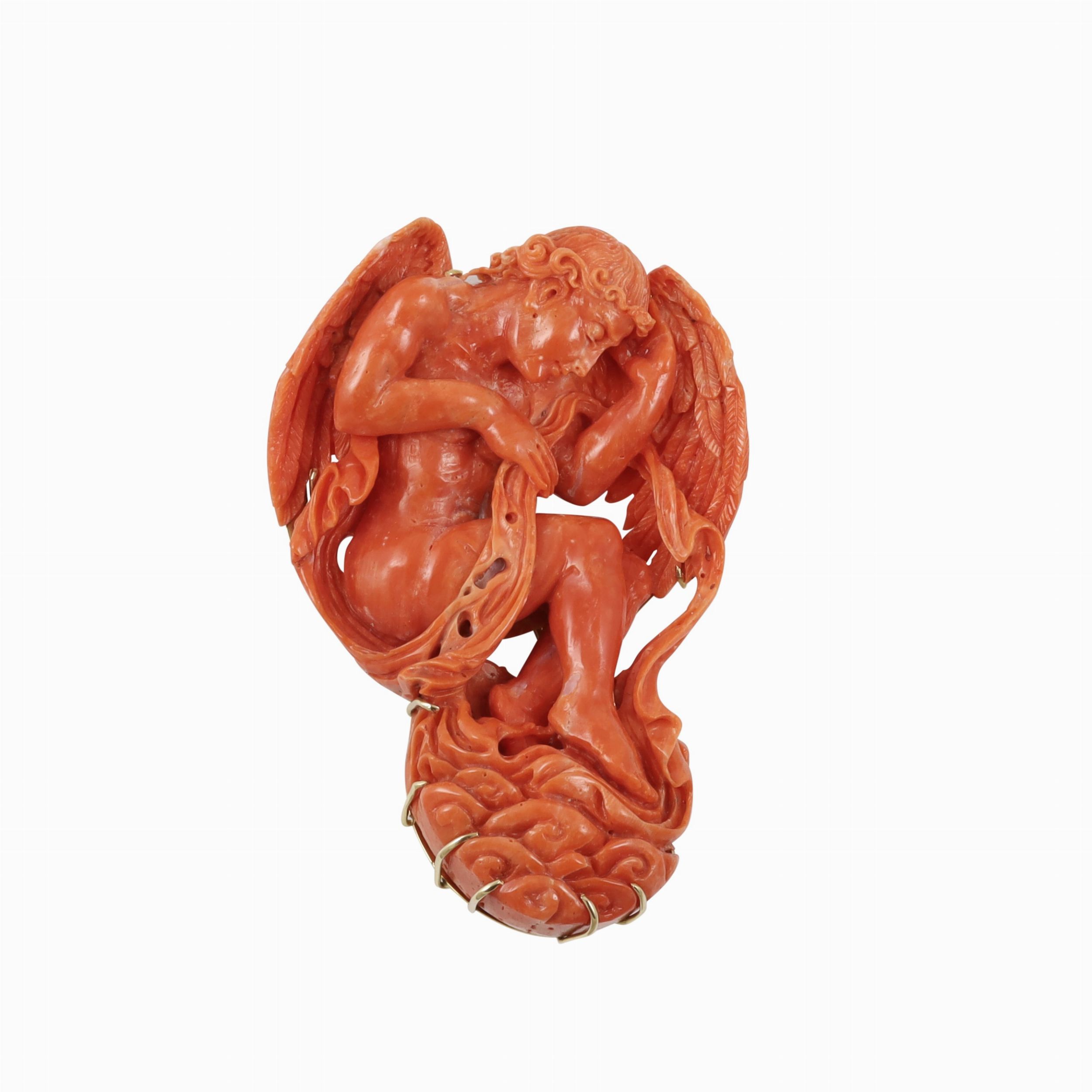 doppio uso con scultura in corallo raffigurante un angelo, montatura in oro giallo, gr. 91,1. Dimensioni 9 x 6 cm ca. Firmata: Demeglio