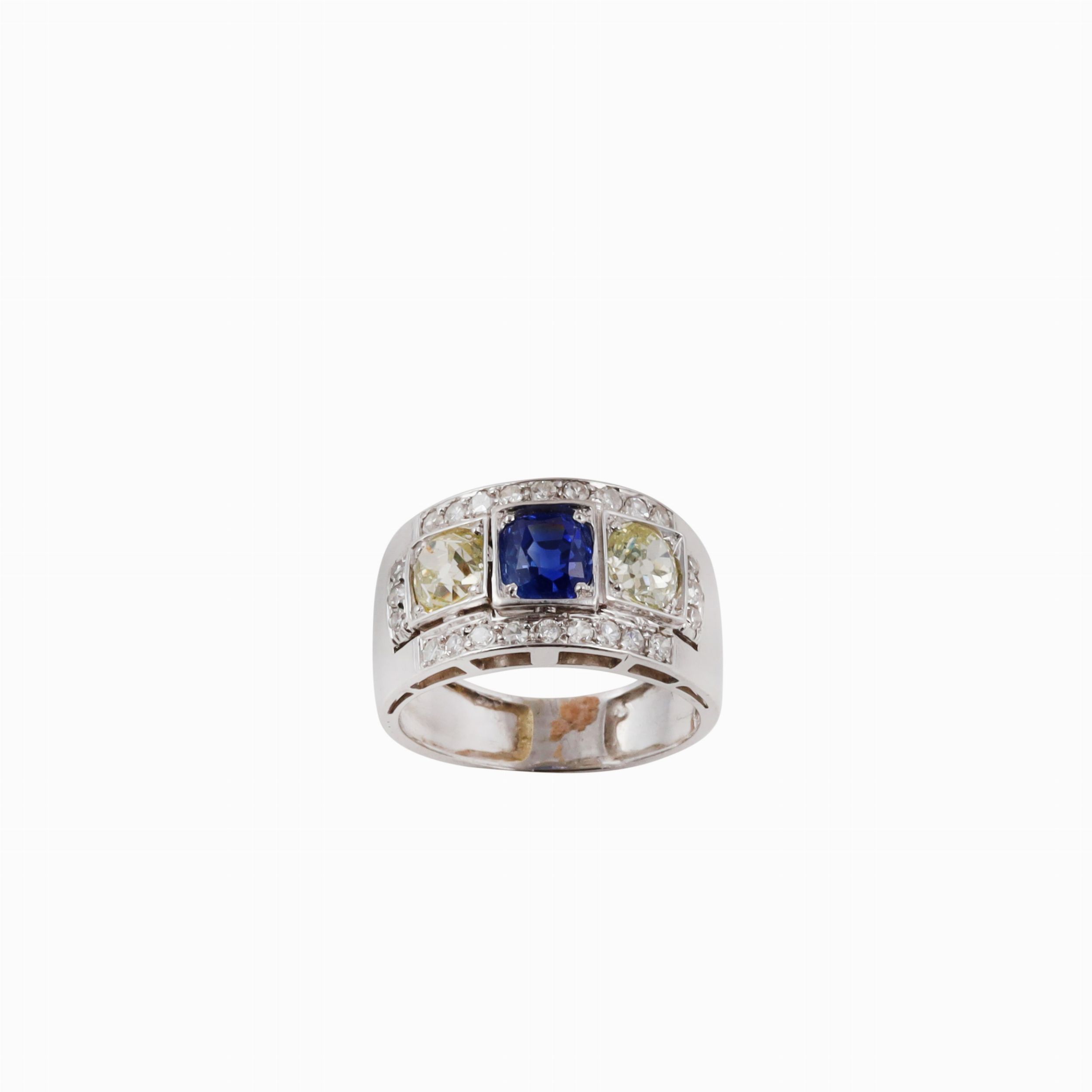 in platino a fascia con zaffiro del peso d i 1 ct ca., posto al centro, affiancato da due diamanti taglio antico europeo del peso complessivo di 0,85 ct ca. e piccoli diamanti ad ornamento, gr. 8,1. Misura 15