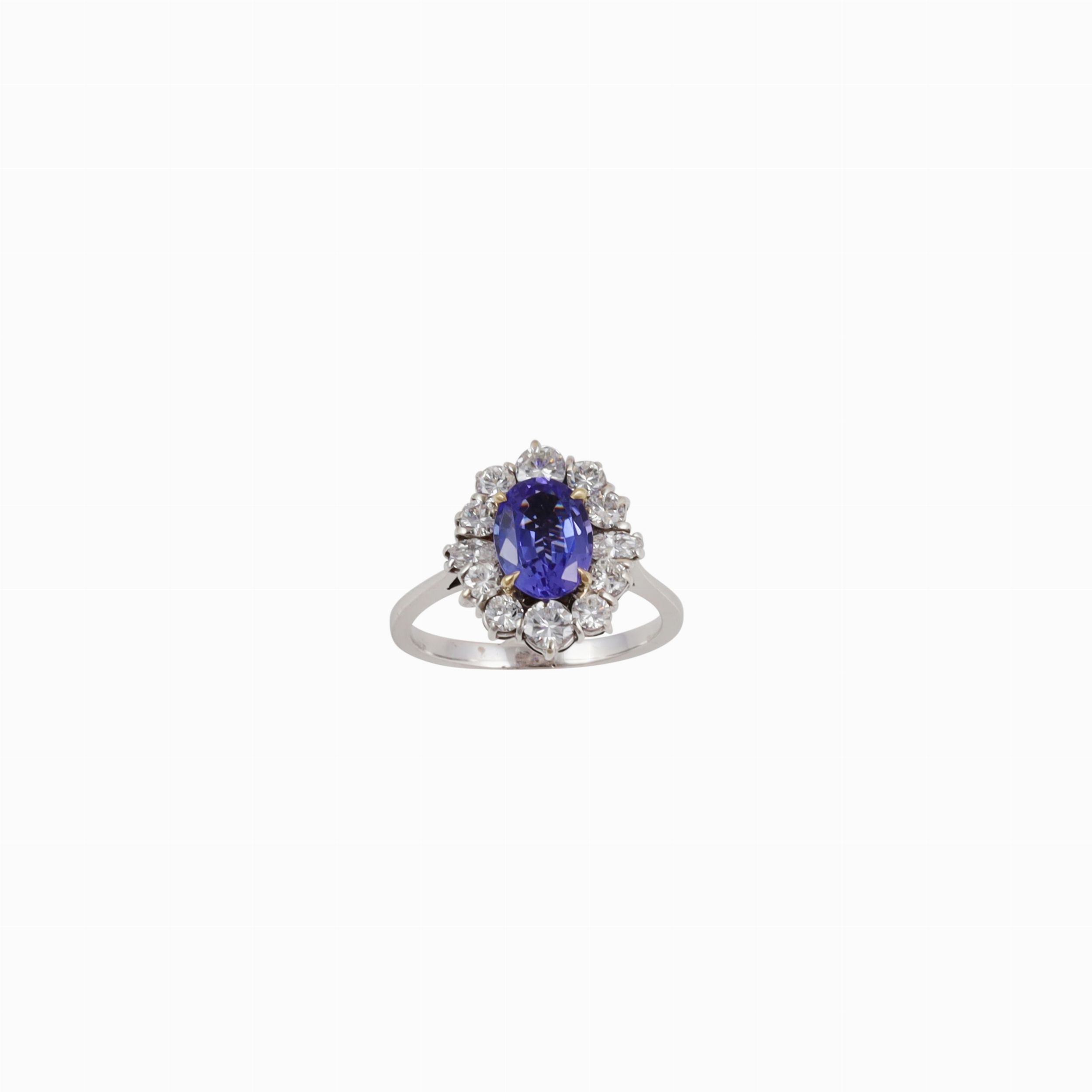 in oro bianco con tanzanite ovale del peso di 1,50 ct ca., contornata da brillanti e diamanti taglio navette. Diamanti del peso complessivo di 0,70 ct ca., gr. 5. Misura 19