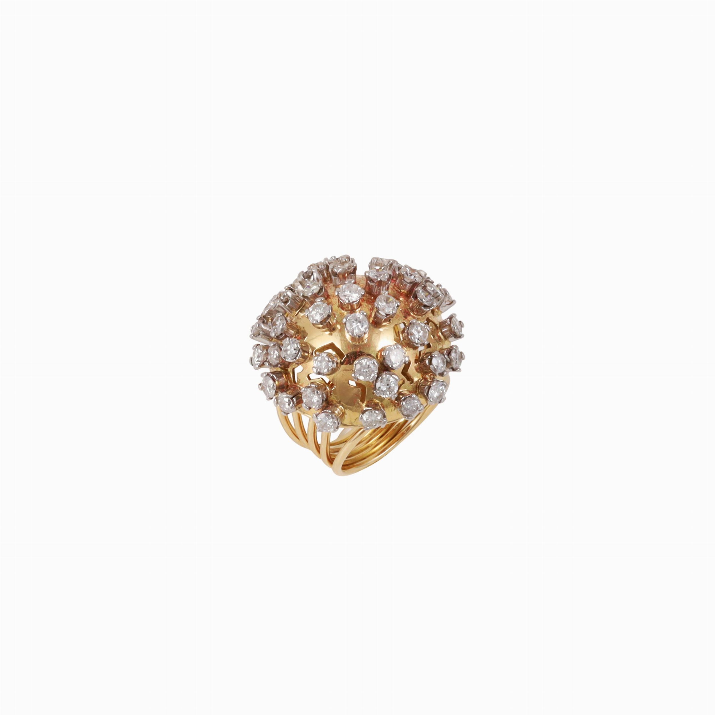 a cupola in oro giallo e bianco punteggiato di brillanti del peso complessivo di 2,50 ct ca., gr. 17,8. Misura 11,5