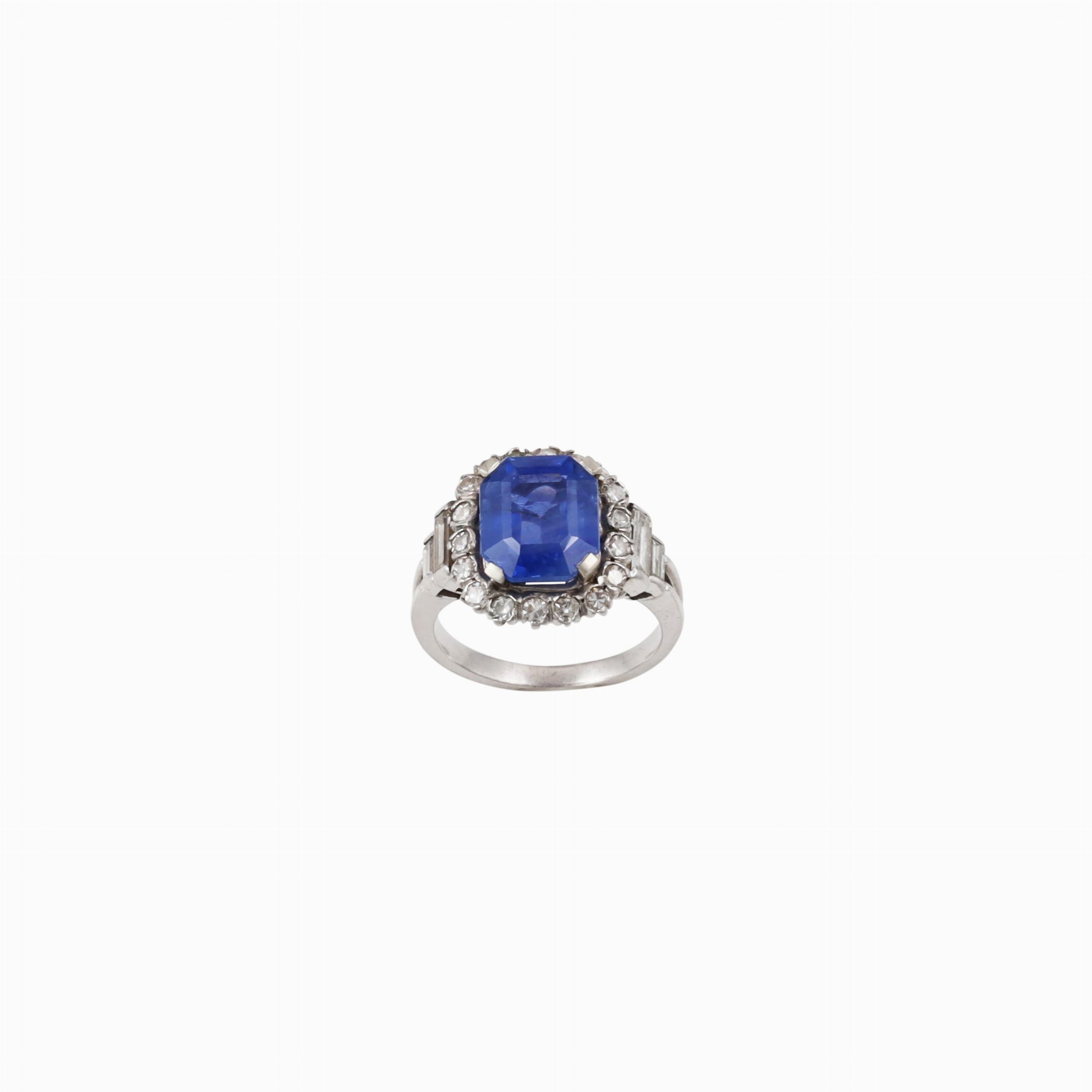 in platino con zaffiro ottagonale, non trattato termicamente, del peso di 4,40 ct ca., contornato da diamanti tondi e affiancato da diamanti taglio baguette, gr. 6,9. Misura 10