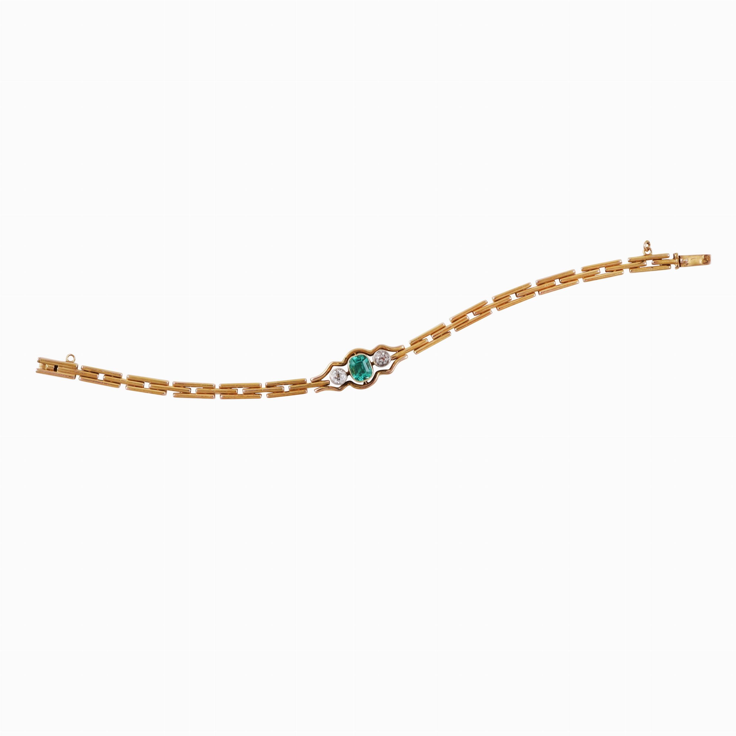 a segmenti snodati in oro giallo, al centro uno smeraldo taglio a cuscino affiancato da due diamanti taglio antico europeo entro castoni in platino, gr. 19,2. Lunghezza 18 cm