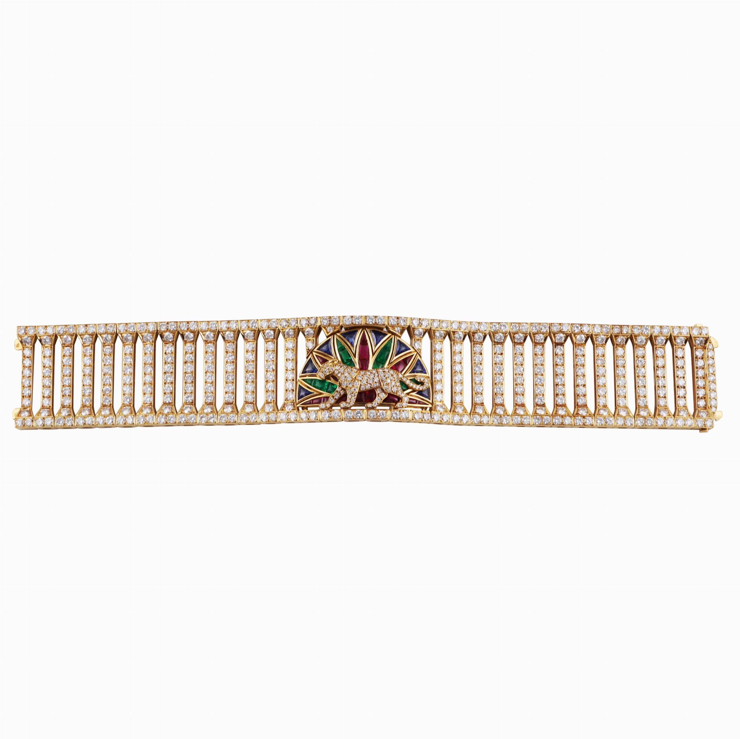 a larga fascia costituito da elementi colonnari, realizzato interamente in oro giallo e brillanti, evidenziato al centro da un motivo a semiluna in zaffiri, rubini e smeraldi con pantera in pavé di brillanti, gr. 117,7. Diamanti del peso complessivo di 23 ct ca. Corredato da custodia originale. Lunghezza 20 cm Firmato: Cartier Numerato: 633932