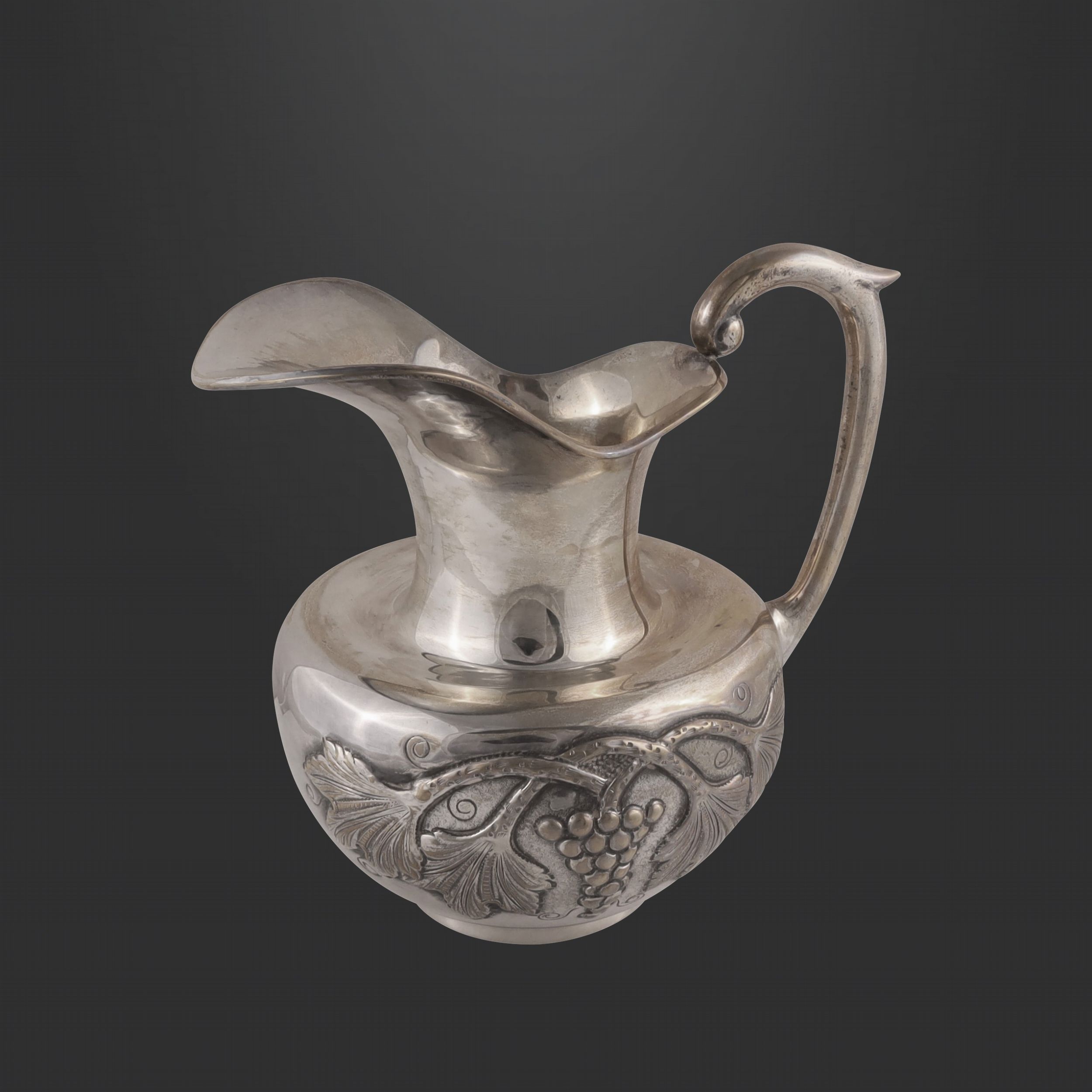 in argento a corpo espanso e ansa curvilinea, decoro a sbalzato raffigurante un tralcio di vite con grappolo, gr. 600 ca. Altezza 22 cm ca.