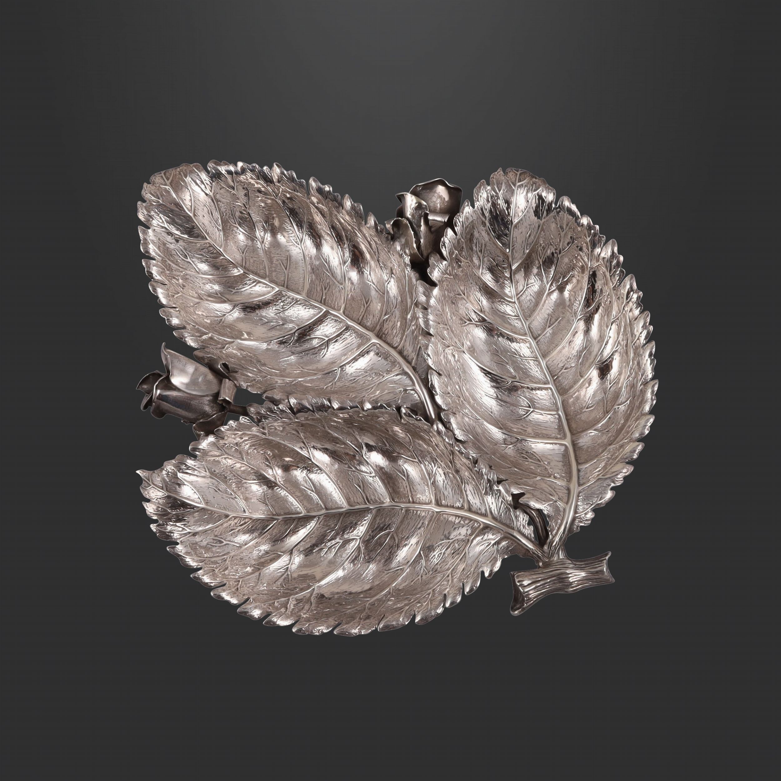 in argento 925, ramage con cestelli in forma di foglia e ornati a guisa di boccioli di rosa, gr. 320 ca. Corredato da custodia originale. Dimensioni 20 x 17 cm, altezza 2 cm ca. Firmato: Gianmaria Buccellati