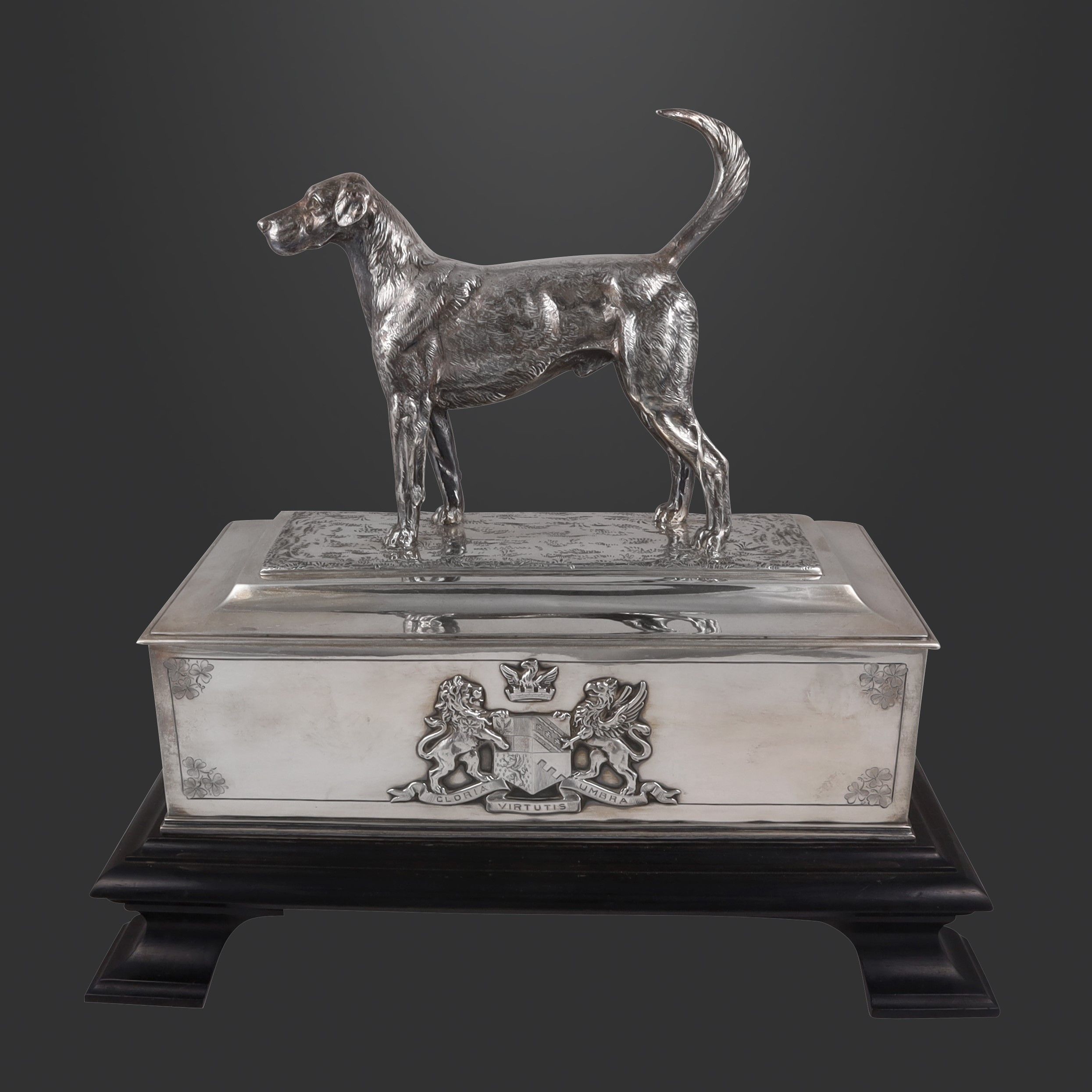 in argento su base in legno. Corpo a sezione rettangolare con specchi lisci al centro un leone e un grifone applicati con stemma araldico e motto 'Gloria umbra virtus', ornati cesellati a guisa di trifoglio. Sui fianchi ulteriore stemma araldico con motto 'Integritas' e dediche impresse. Coperchio con fastigio a raffigurare un cane da caccia inglese. All'interno scomparti in legno. gr. lordi 2.920 ca. Dimensioni 31 x 17,5 (h) 29,5 cm ca. Inghilterra