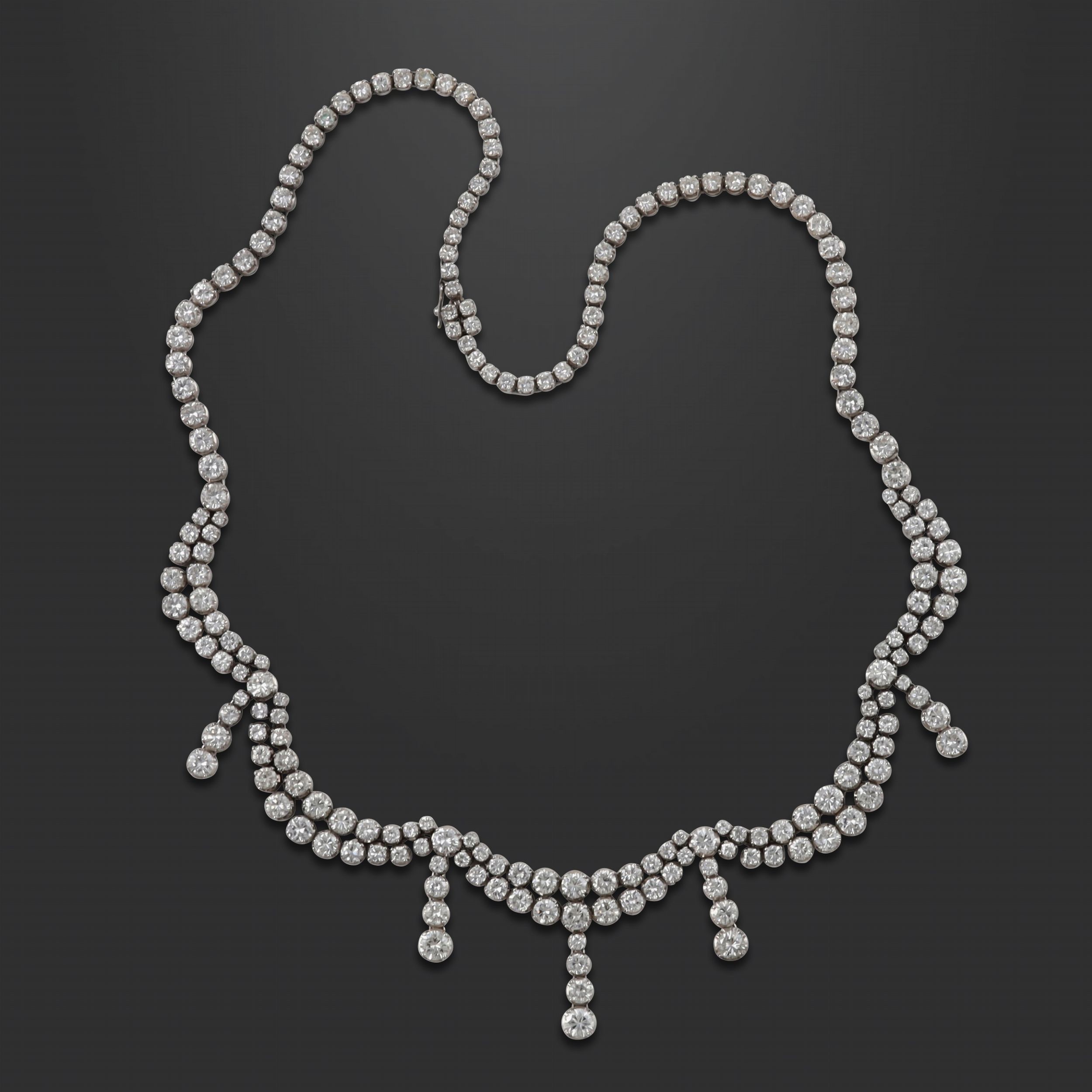 rivière interamente realizzata in oro bianco e brillanti evidenziata al centro da motivi a festone con cinque pendenti formati da brillanti disposti in linea, gr. 57. Diamanti del peso complessivo di 18 ct ca. Lunghezza 45 cm ca.