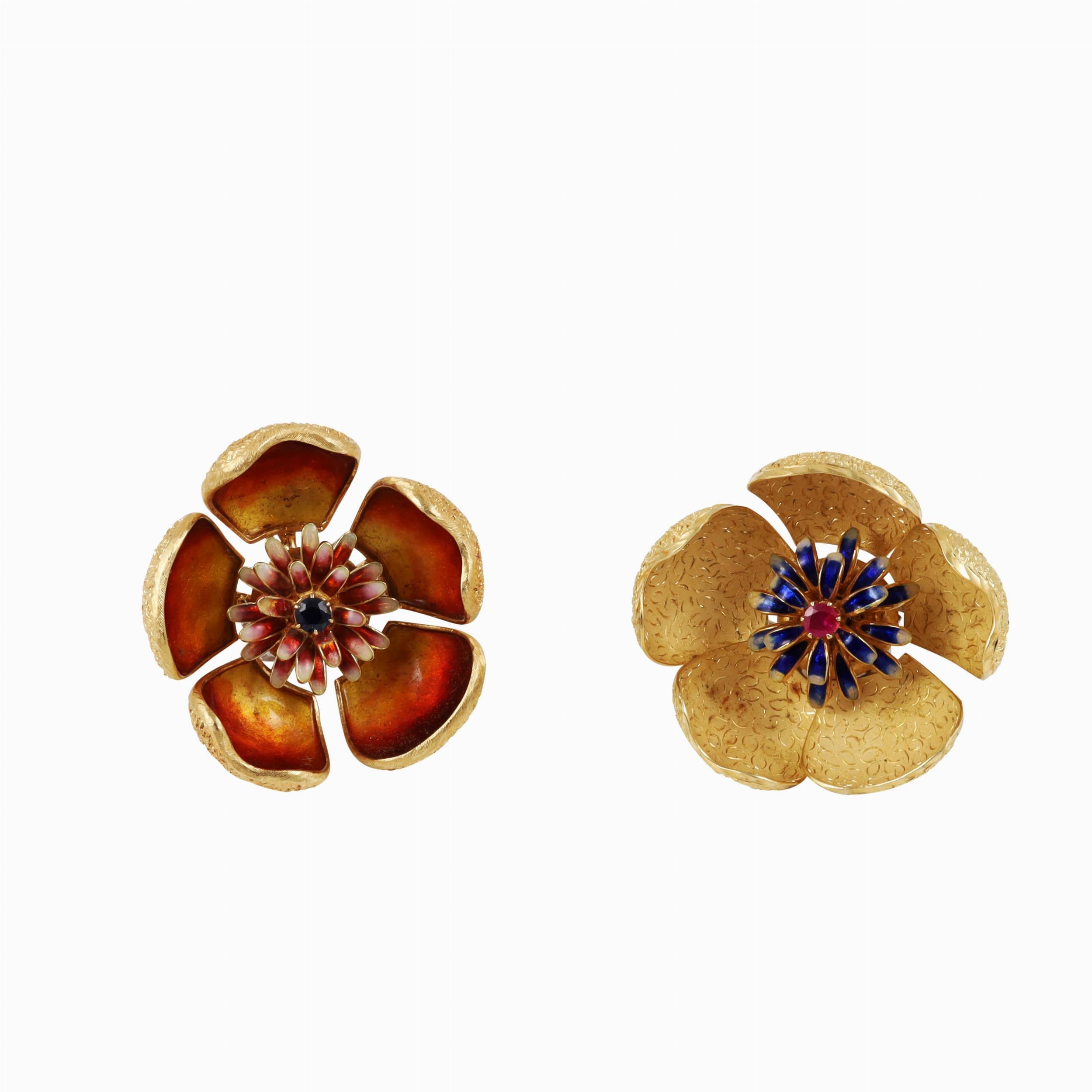 a forma di fiore in oro giallo e bianco con petali apribili, pistilli in smalti policromi impreziositi rispettivamente da uno zaffiro e da un rubino, gr. complessivi 64,7. Diametro 4 cm ca.