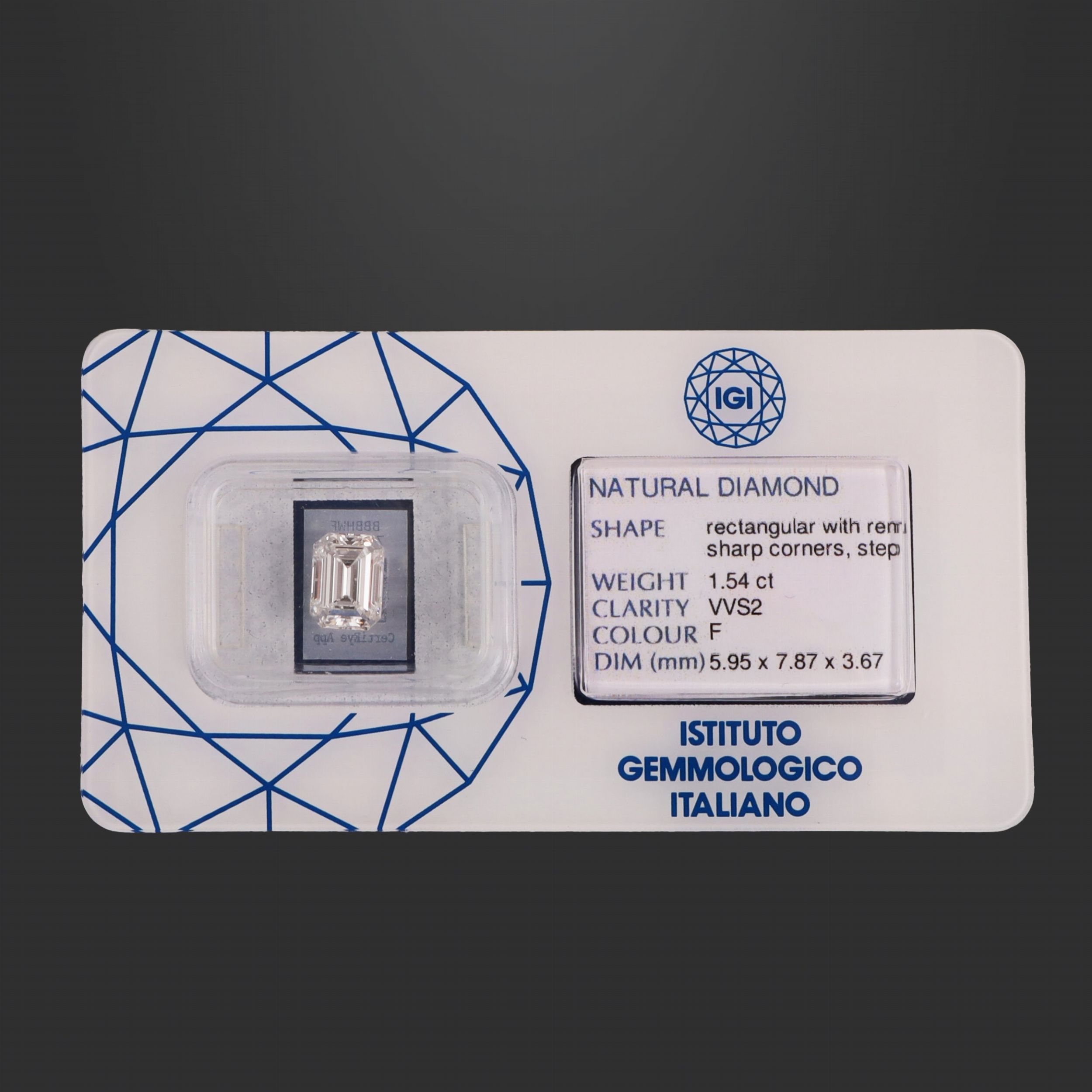 taglio rettangolare ad angoli tronchi, a gradini, del peso di 1,54 ct, privo di montatura. Analisi gemmologica n. 56729 del 13/03/2024 rilasciata dal laboratorio IGI di Milano