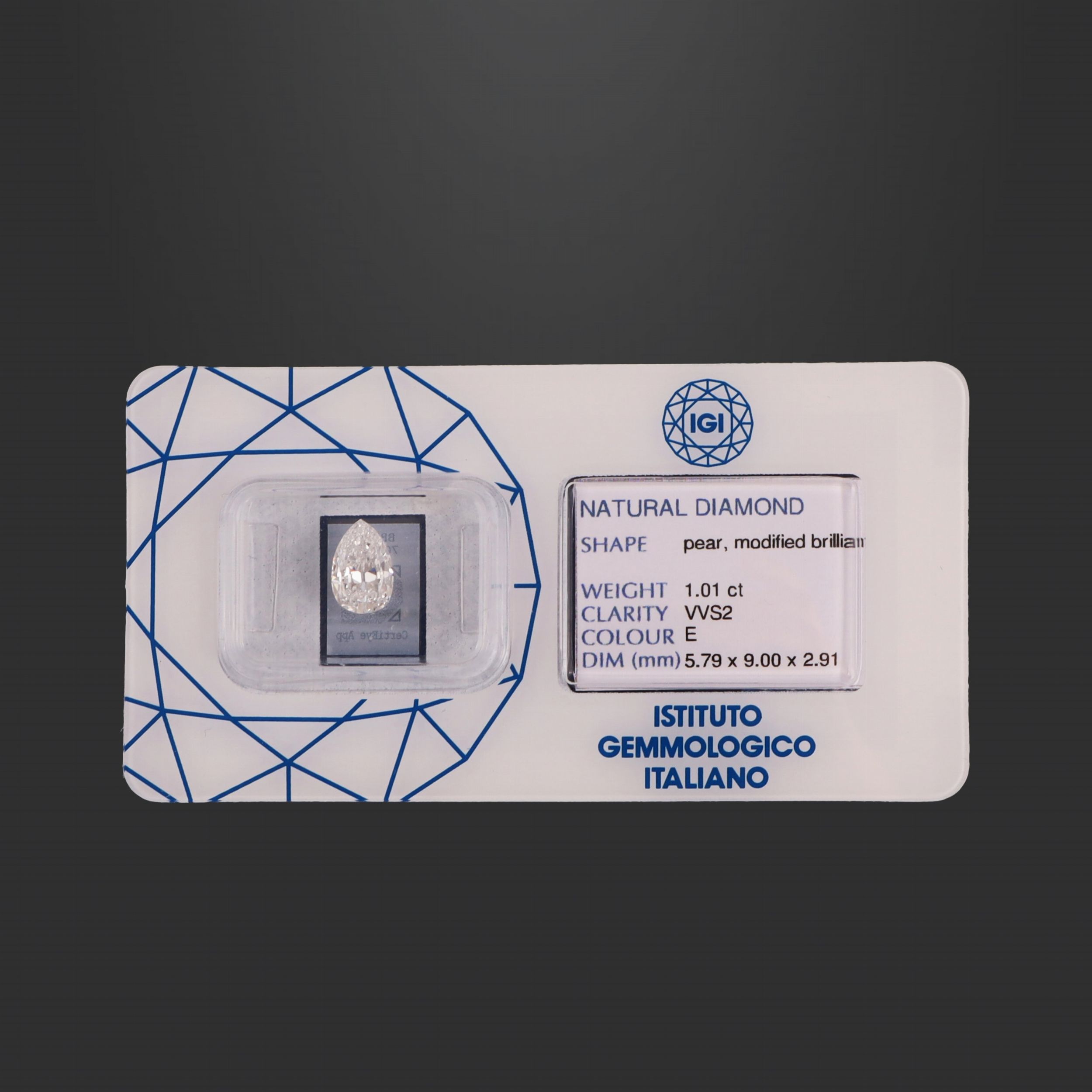 taglio a goccia, del peso di 1,01 ct, privo di montatura. Analisi gemmologica n. 56727 del 13/03/2024 rilasciata dal laboratorio IGI di Milano