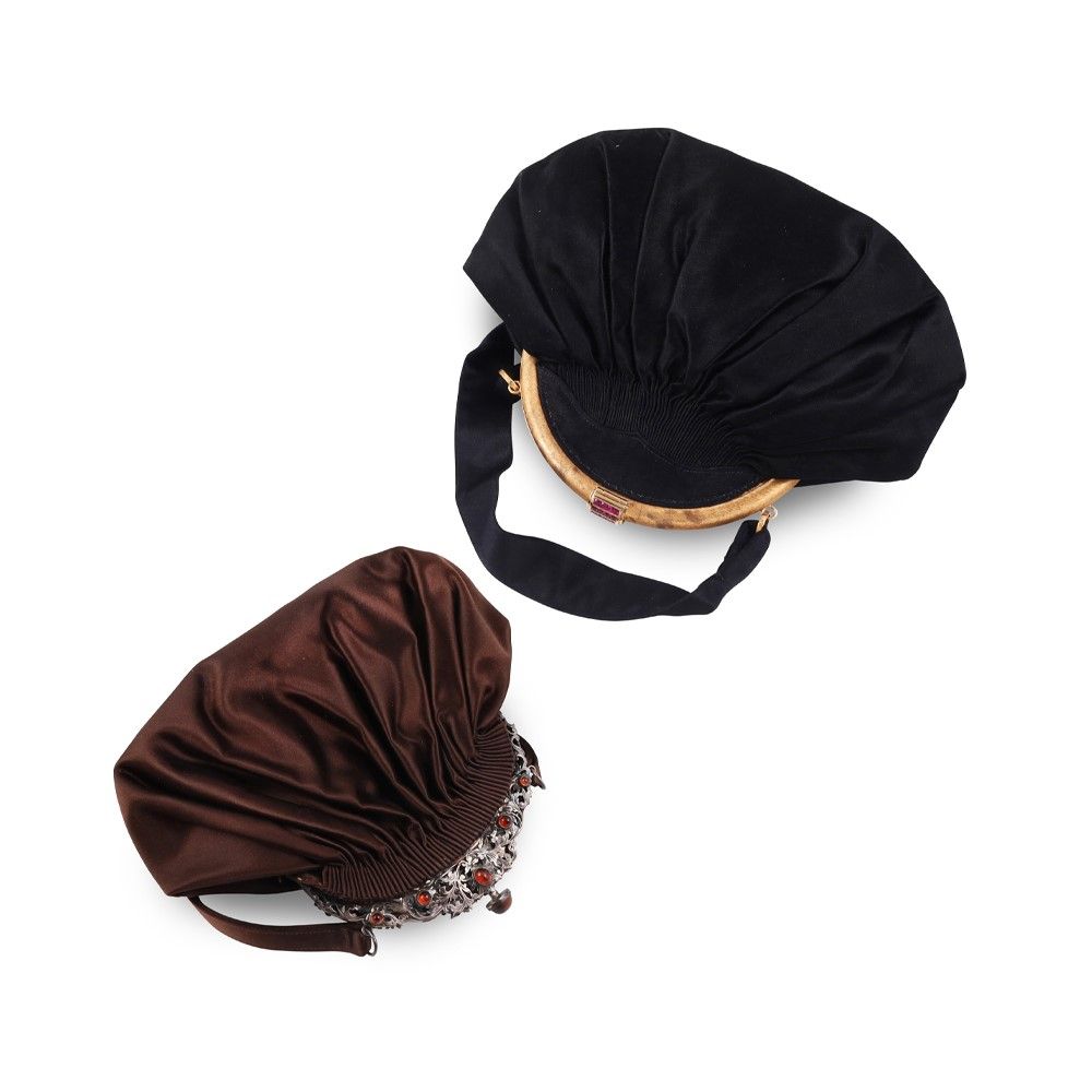 rispettivamente in raso nero con chiusura a semiluna in oro giallo e rubini carré e in raso marrone con chiusura traforata in argento e ambre. Misura 22 x 17 cm ca. e 23 x 20 cm ca.