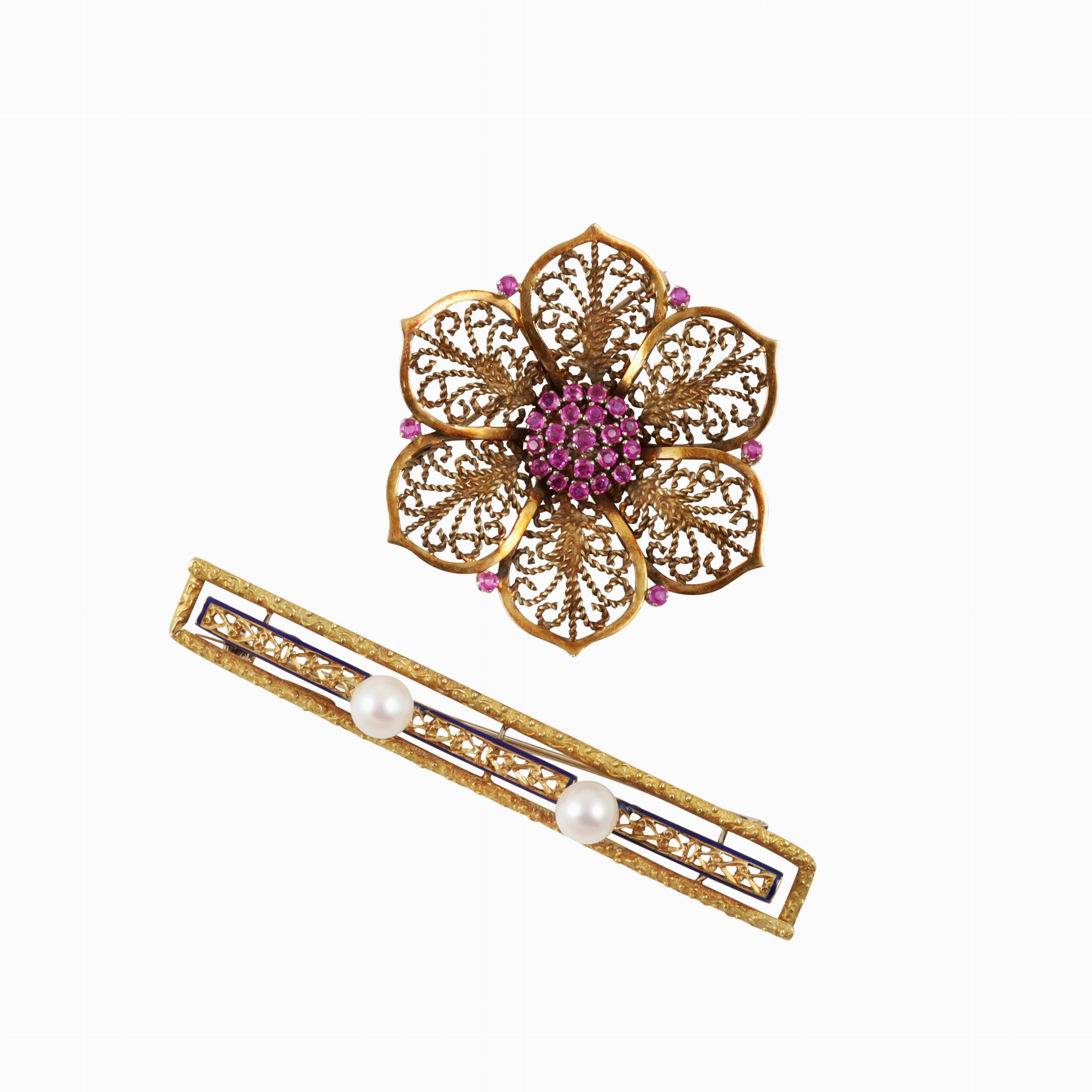 in oro giallo raffiguranti un fiore con petali in filigrana ornata da rubini e una barretta cesellata con perle coltivate e smalto blu, gr. complessivi 27,4. Dimensioni 5 x 5 cm ca. e 8 x 1 cm ca.