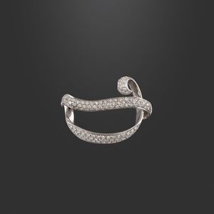 in oro bianco a nastro, ornata da diamanti del peso complessivo di 4,50 ct ca., gr. 11,4. Dimensioni 5 x 2,5 cm [..]