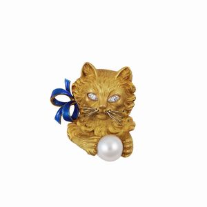 a clip raffigurante un gatto con occhi in diamanti, fiocco in smalto blu e perla coltivata, realizzata in oro [..]