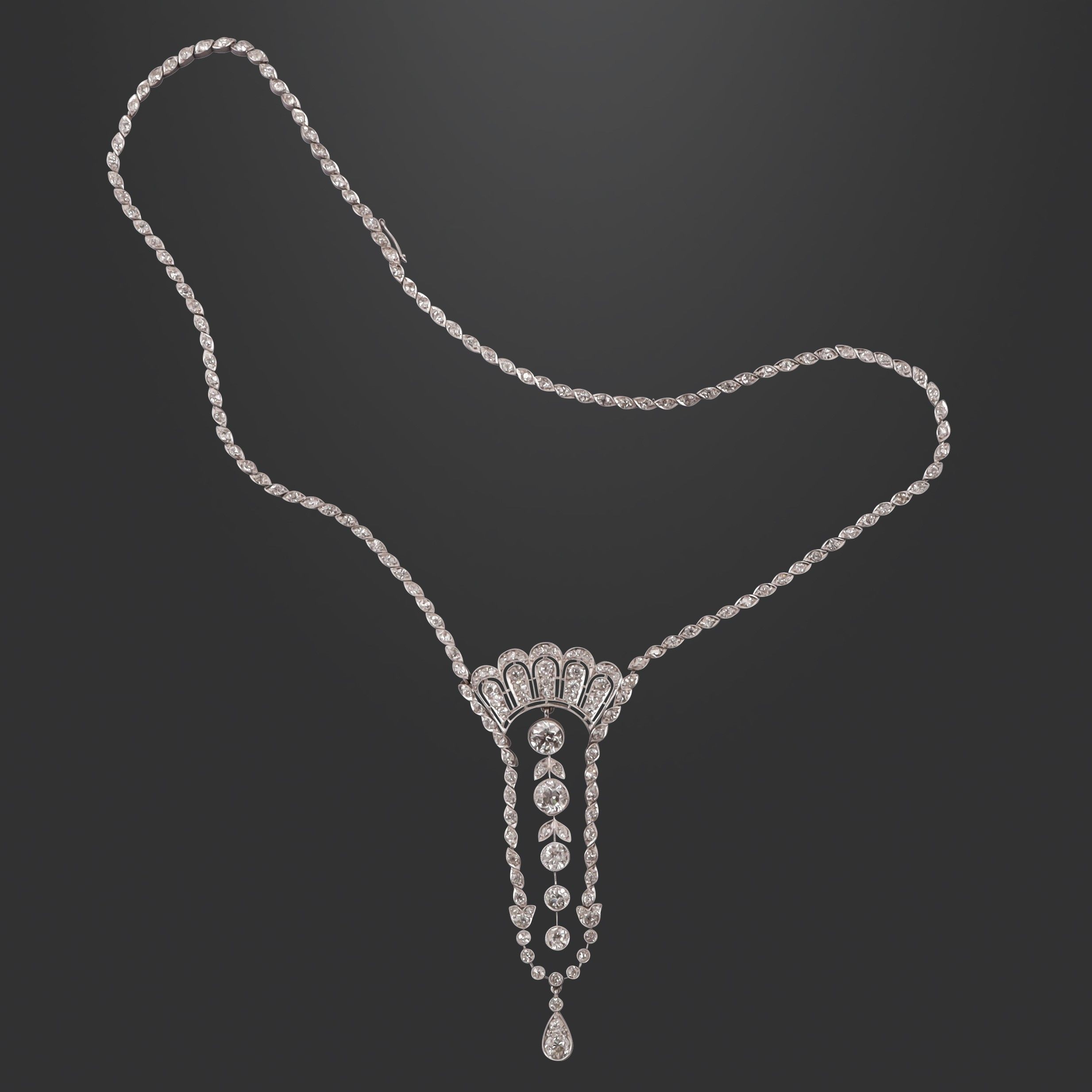 in platino a rivičre di diamanti. La rivičre, trattenuta da un motivo a ventaglio in brillanti, prosegue a delineare un morbido pendente d'ispirazione vegetale che incornicia una fila di brillanti piů grandi in parte separati da piccole foglie. Terminale con due diamanti entro motivo a goccia, gr. 30,1. Cinque diamanti taglio antico europeo di dimensioni maggiori del peso complessivo di 2 ct ca., restanti diamanti taglio antico europeo del peso complessivo di 4 ct ca. Lunghezza 41 cm