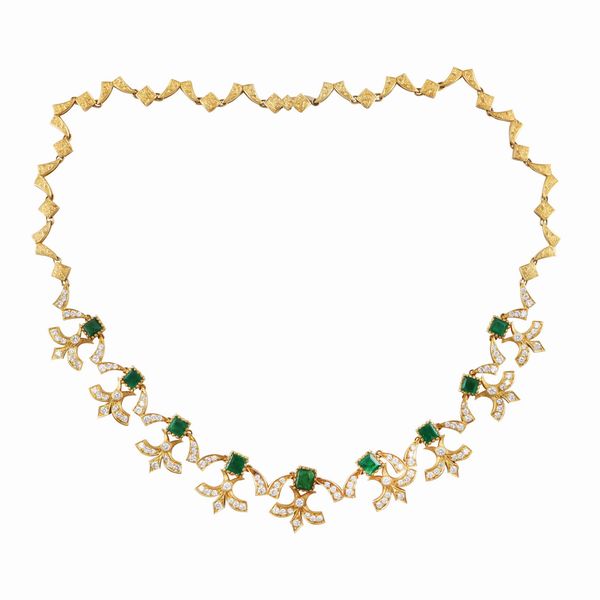 in oro giallo a motivi floreali stilizzati, ornato al centro da smeraldi e brillanti, gr. 40,7. Brillanti del peso complessivo di 1,60 ct ca. Lunghezza 42 cm Firmata: Michele - Casieri