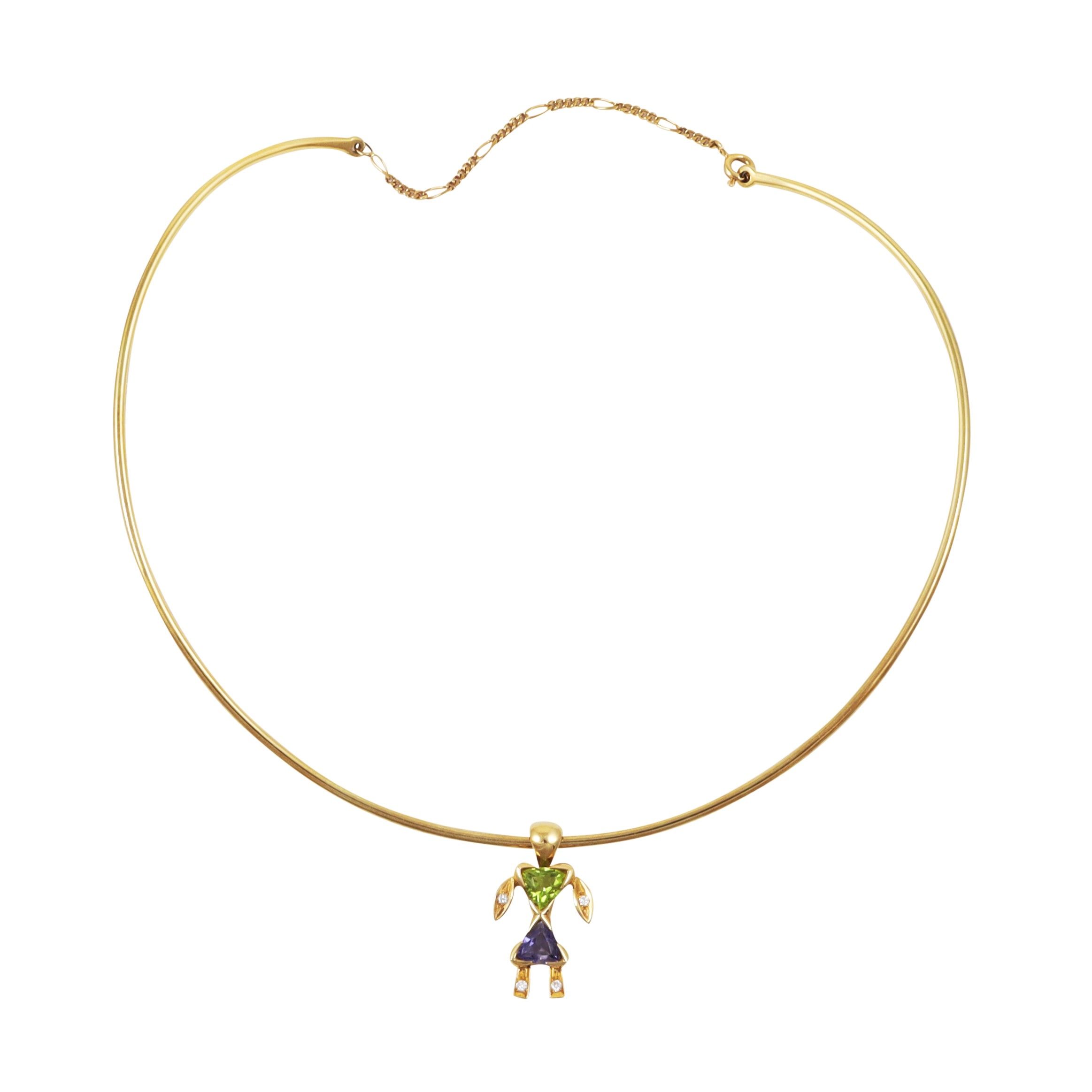 in oro giallo a filo rigido a sostegno di un pendente a guisa di figura stilizzata con peridoto, iolite e piccoli brillanti, gr. complessivi 20.  Diametro interno 12 cm ca.
