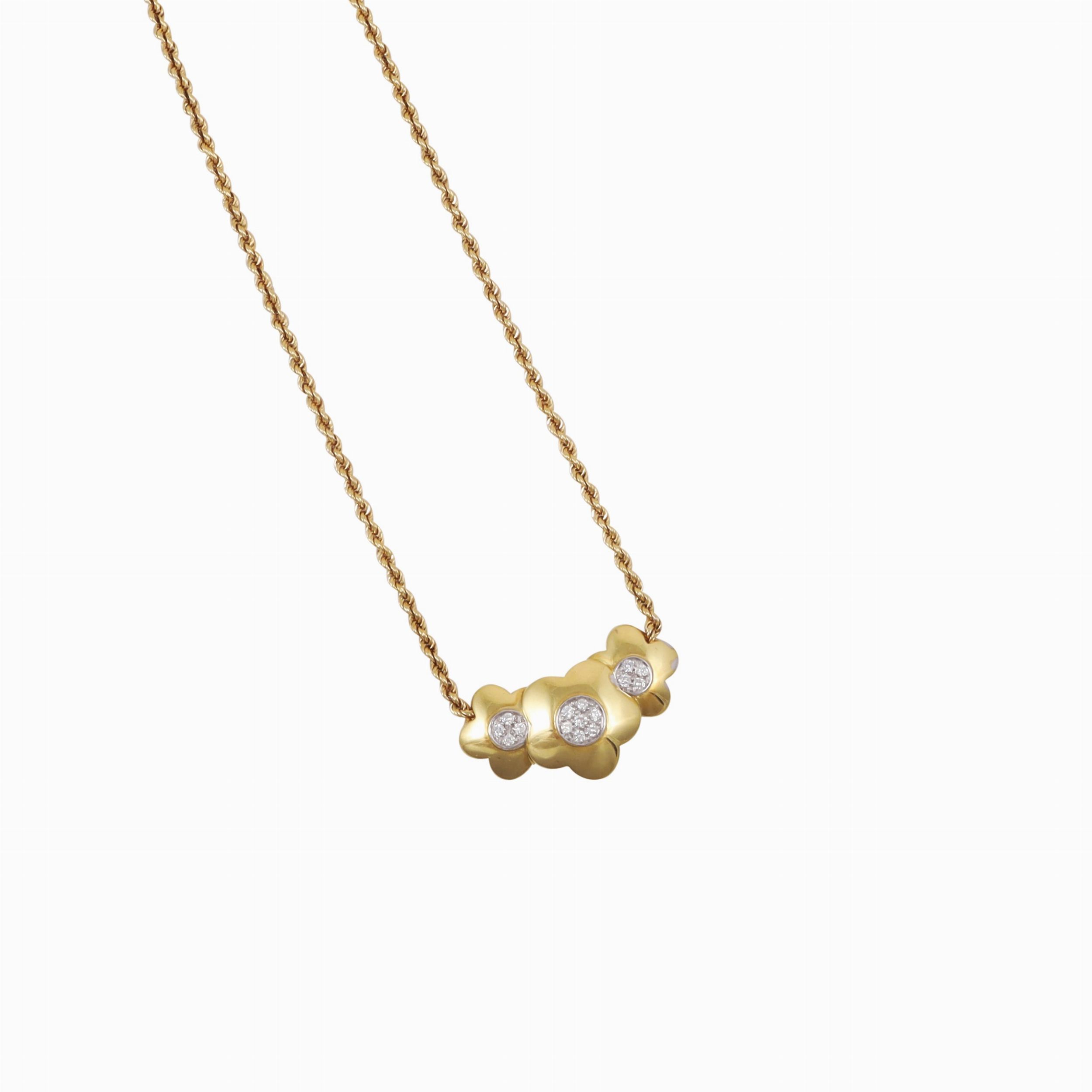in oro giallo con catena a cordoncino ritorto e motivo anteriore a tre fiori con brillanti, gr. 21,3. Lunghezza 44 cm