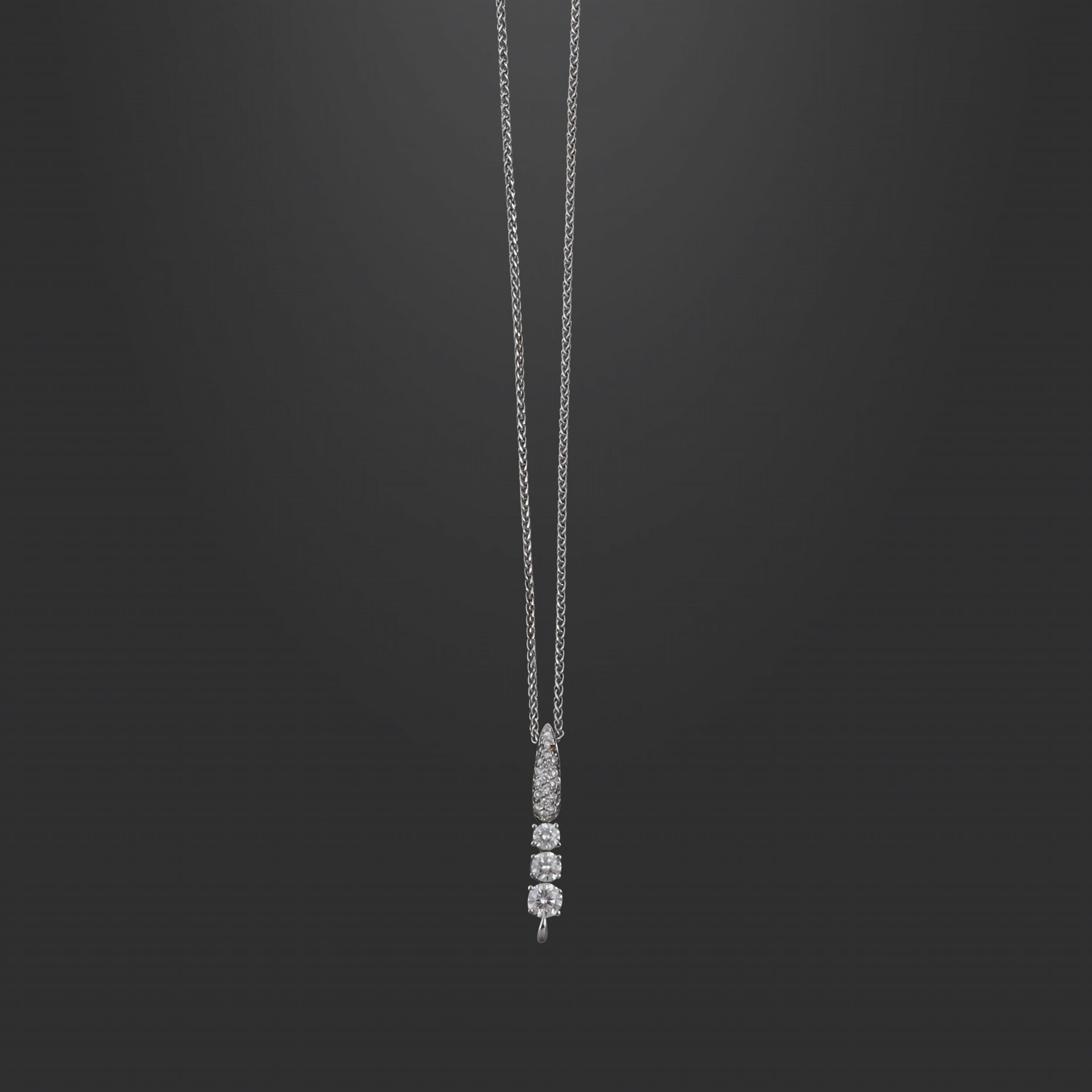 catenina con pendente in oro bianco, formato da tre brillanti disposti in linea sospesi ad un motivo a goccia in pavé di piccoli brillanti (uno mancante). Brillanti del peso complessivo di 0,80 ct ca., gr. 6. Lunghezza 42 cm Firmato: Recarlo
