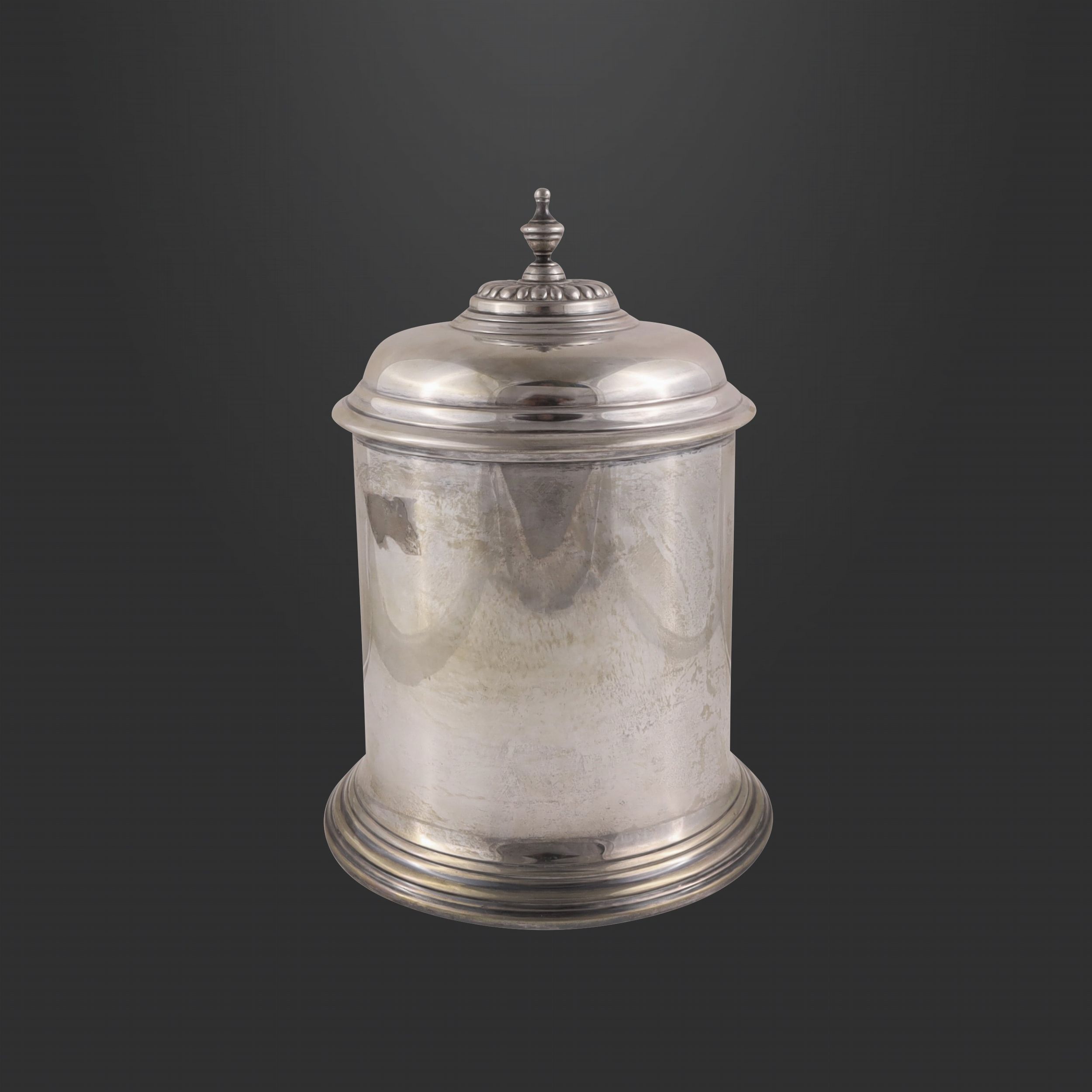 in argento con contenitore interno termico. Corpo cilindrico con motivo gradinato alla base, medesimo ornato ripreso anche sul coperchio sormontato da pomolo piriforme, gr. netti 880. Dimensioni 17 x (h) 24 cm ca. Numerario: 20 AL (Ricci & C. s.p.a. - Alessandria)