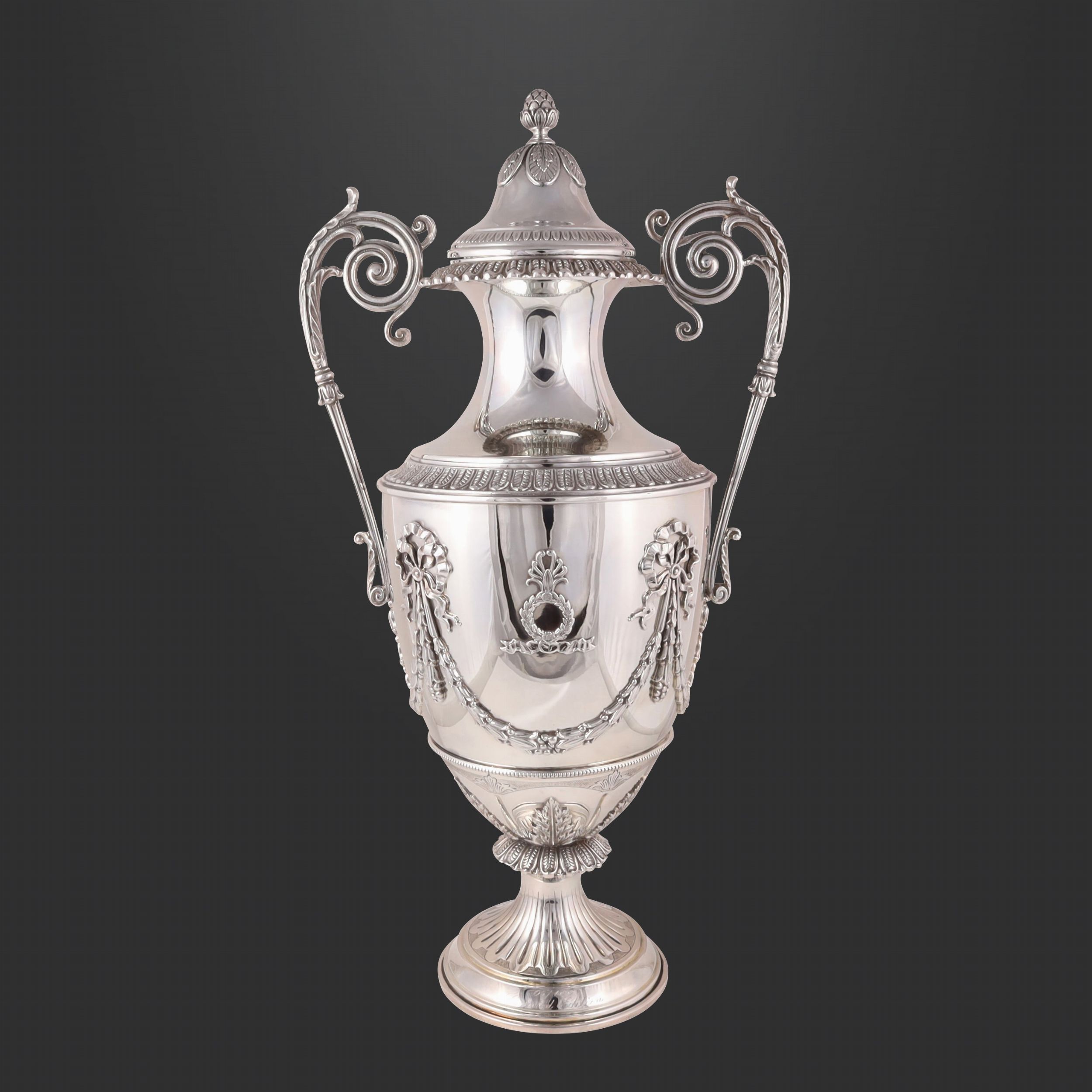 in argento 925/1000 stile Impero, corpo a vaso con fascia e bordure a palmette, ricco decoro a ghirlande d'alloro, nastri, nappe e foglie d'acanto. Poggiante su base circolare con nodo fogliato. Coperchio a campana con fastigio a pigna, gr. 2.900. Corredata da scatola originale e garanzia. Altezza 50 cm ca. Incisione alla base: Limited Edition 05/100 Punzone impresso: Fabergé con stemma Numerario: 410 FI (Braganti Antonio s.r.l. - Firenze)
