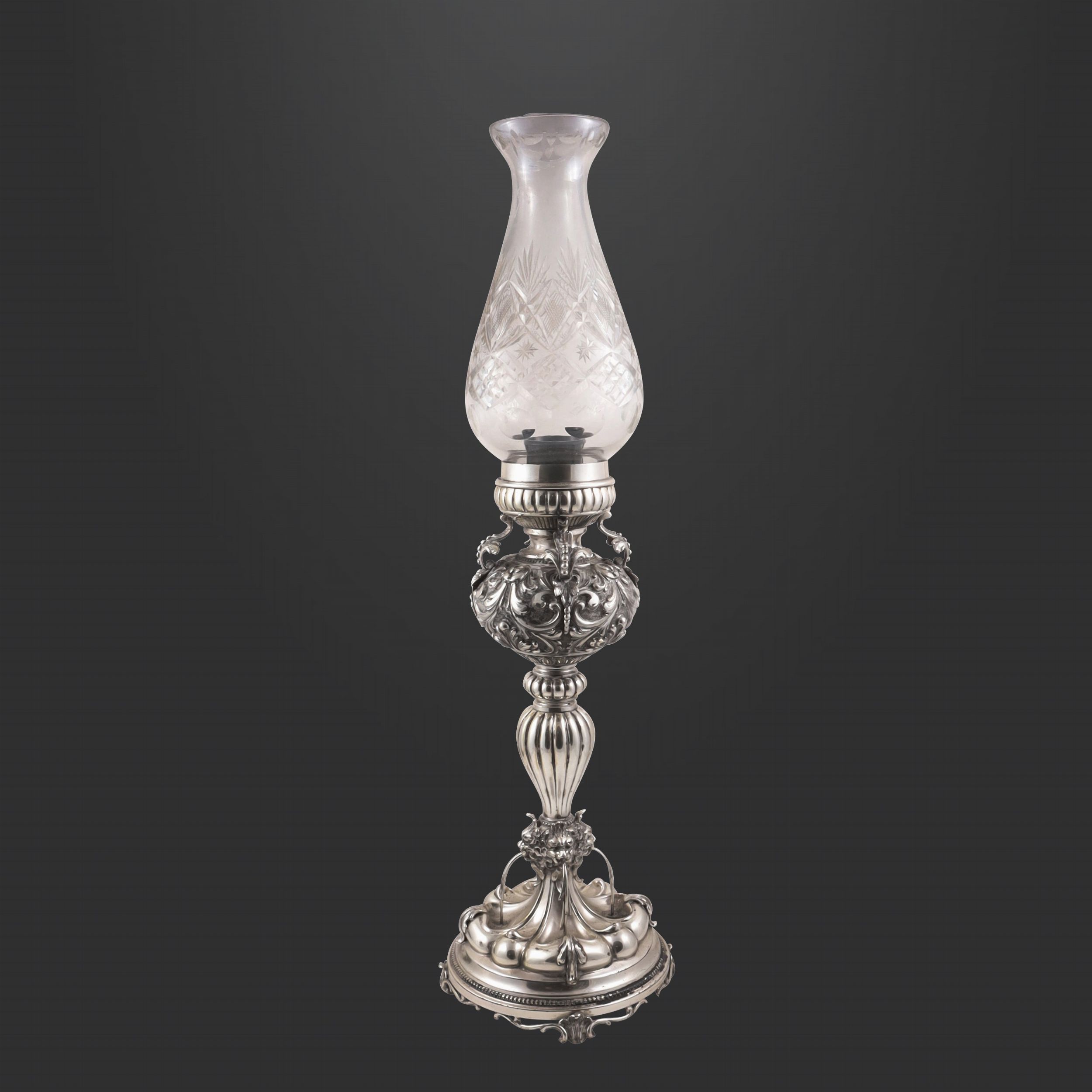 in argento raffigurante una fontana a quattro teste leonine con fusto a balaustro baccellato e globo a motivi fogliacei; base circolare perlinata poggiante su piedini, gr. lordi 1.000 ca. (escluso paralume). Paralume in vetro molato. Non funzionante. Base 17,5 cm ca., altezza complessiva 60 cm ca. Numerario: 245 MI (Fiorentini Guido 'Le Argenterie di Milano' - Milano)