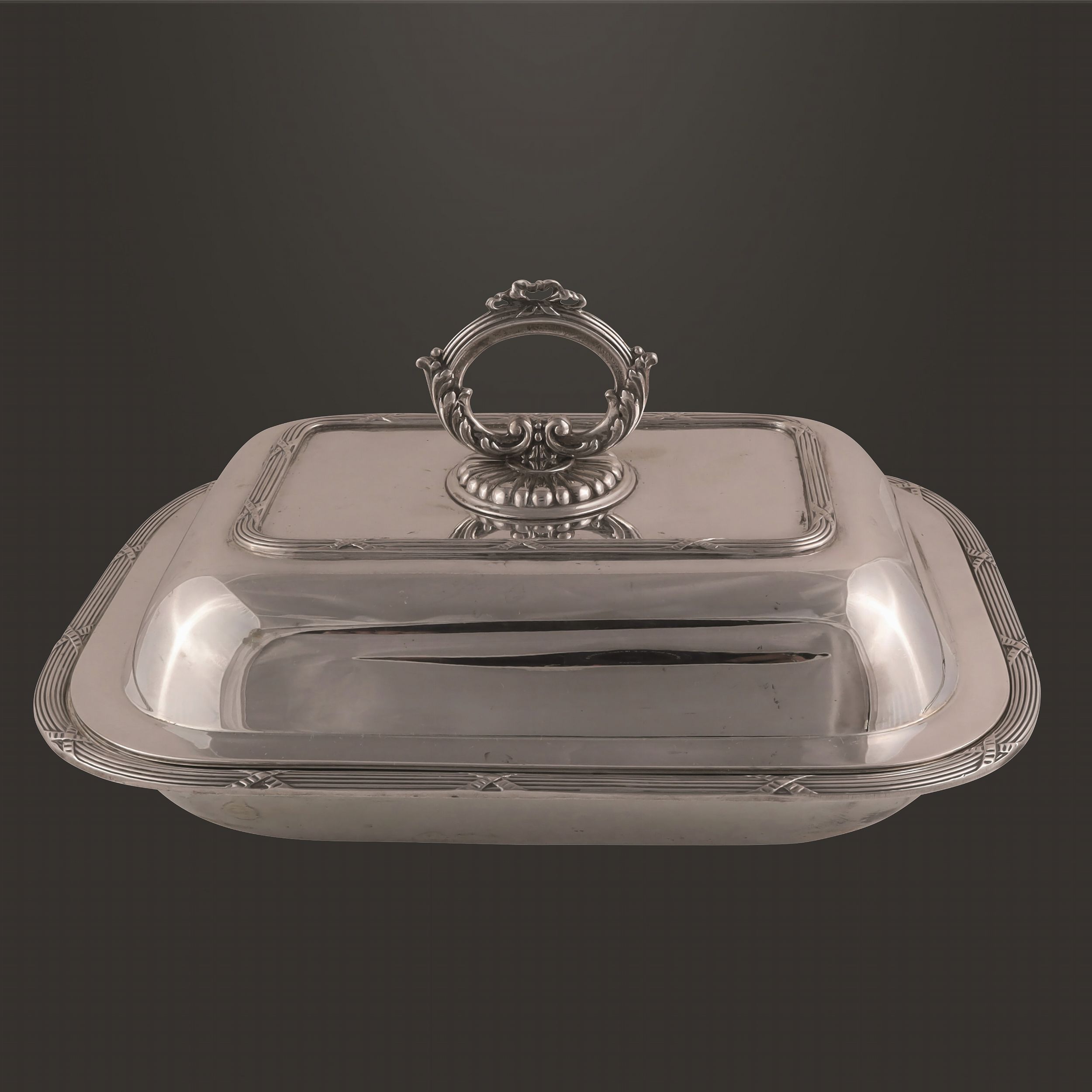 in argento a corpo rettangolare liscio, bordura gradinata con motivi a nastro incrociato, ripresi sul coperchio con presa ad anello, gr. 1.130 ca. Dimensioni 27 x 21 (h) 16 cm ca. Numerario: 20 AL (probabile) corrispondente alla ditta Ricci & C. s.p.a.